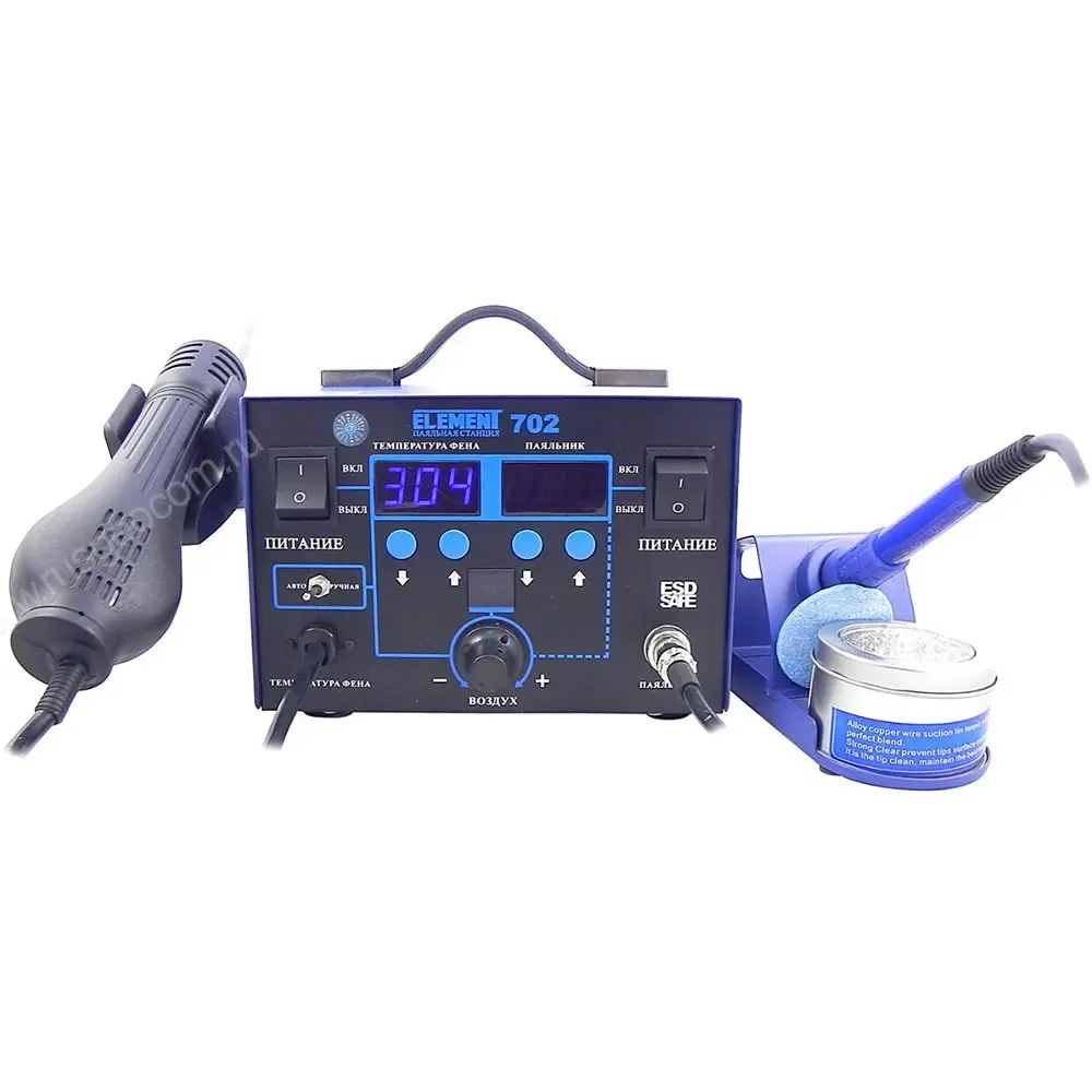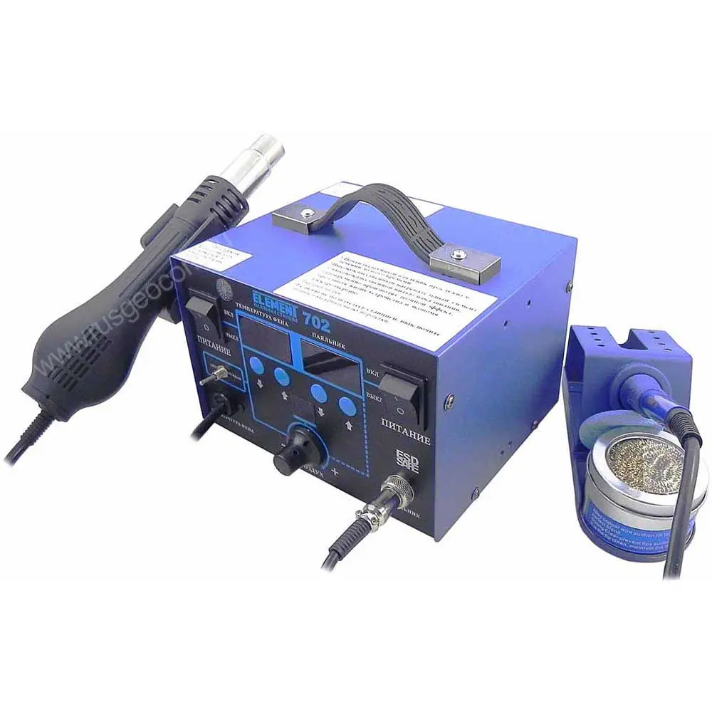 Главные преимущества модели - повышенная температурная стабильность, цифровой дисплей и кнопки управления, которые помогают настроить степень нагрева термофена или жала паяльника с точностью до градуса. Кроме того, в конструкцию ELEMENT 702 встроены механизмы автоматической защиты от перегрева, перегрузки, короткого замыкания.