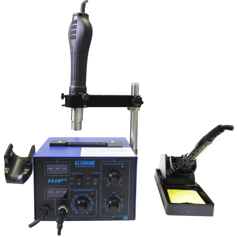 Паяльная станция ELEMENT 852D++ - это двухканальный прибор для фиксации на платах и демонтажа электронных компонентов, а также для термоусадки, разморозки, ремонта пластиковых изделий, сушки и др. Рабочий диапазон фена составляет 100°С - 450°С, паяльника - от 200°С до 500°С.