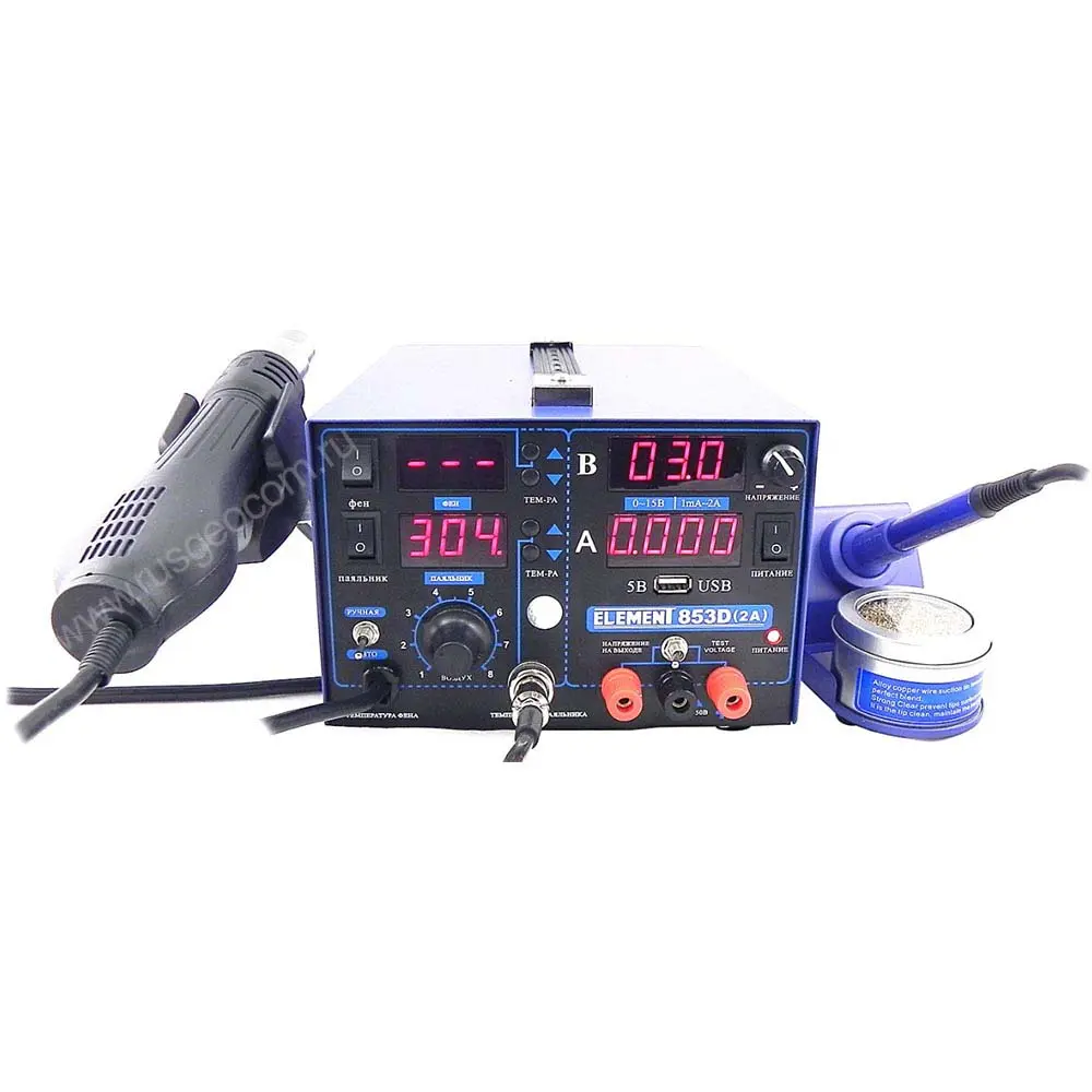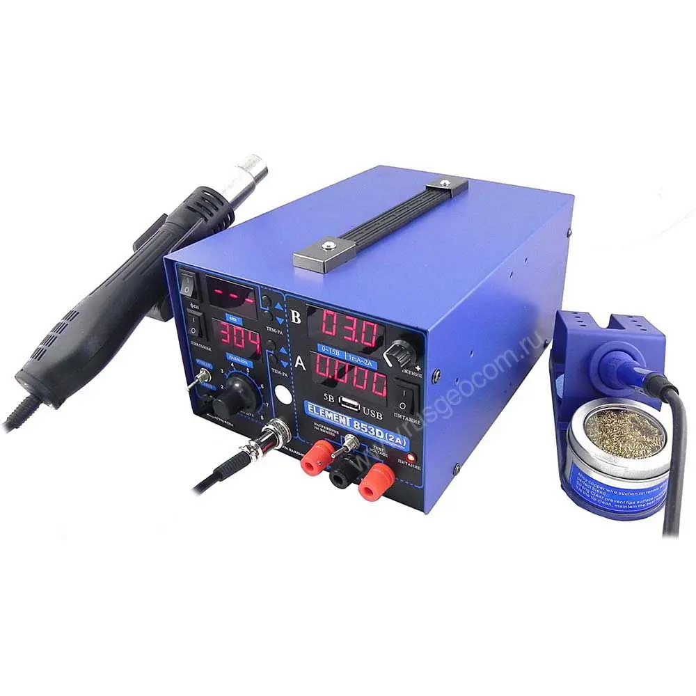 Паяльная станция ELEMENT 853D - это надежный прибор 3 в 1 для пайки и демонтажа электронных компонентов, подачи питания на тестовые схемы а также для термоусадки, ремонта пластиковых изделий, сушки и др.
