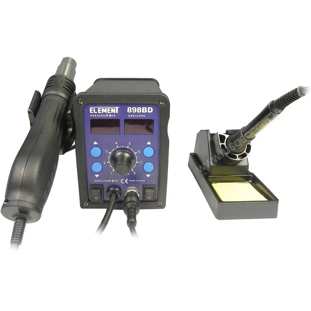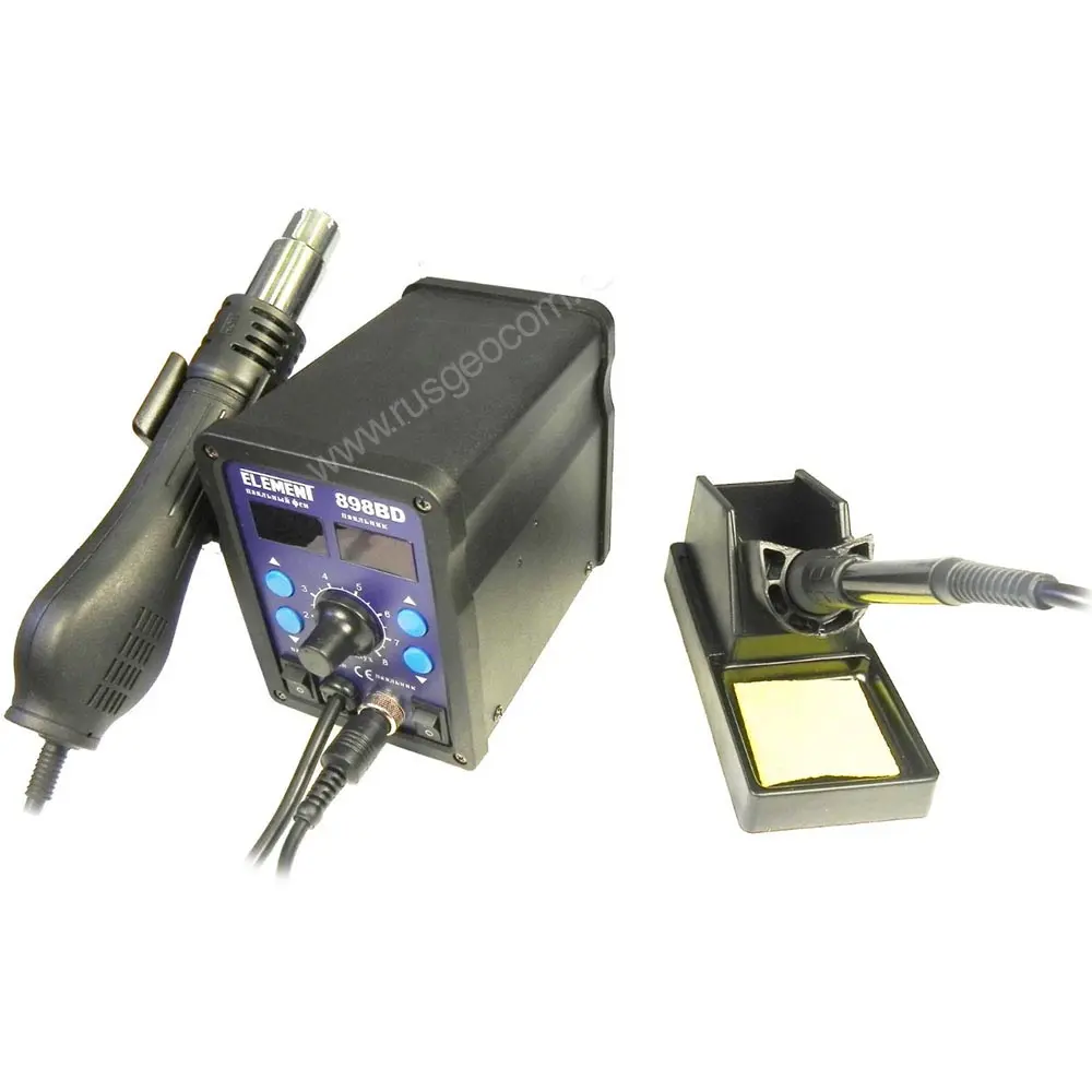 Паяльная станция ELEMENT 898BD служит для пайки и демонтажа электронных компонентов. Прибор также отлично подходит для термоусадки, разморозки, ремонта пластиковых изделий, сушки и др.