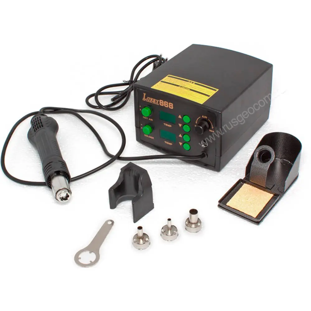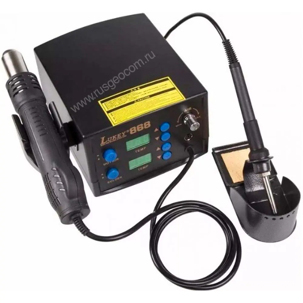 Паяльная станция Lukey 868 служит для демонтажа и установки на платы различных компонентов электроники, корпусных микросхем, может использоваться для пайки пластика и др. Прибор компактен и удобен в использовании, температуру паяльника и термофена можно выставить с точностью до градуса при помощи электронных дисплеев.