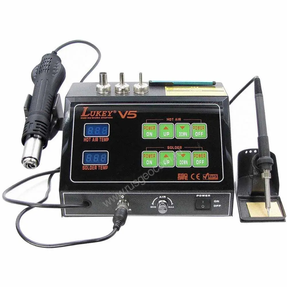 Паяльная станция Lukey V5 служит для демонтажа и установки на платы различных компонентов электроники, а также может использоваться для ремонта компьютерной техники, смартфонов, планшетов, РЭА, пайки пластика и др. Прибор компактен и удобен в использовании, температуру паяльника и термофена можно выставить с точностью до градуса при помощи электронных дисплеев и сенсорных кнопок.