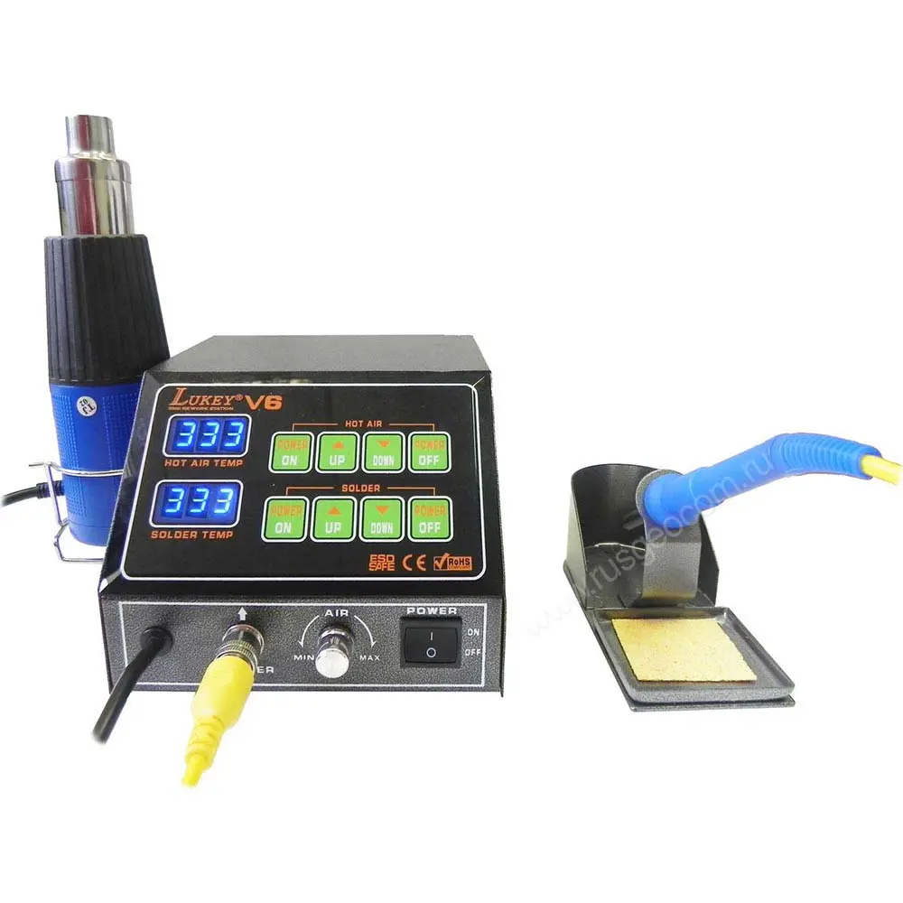 Паяльная станция Lukey V6 служит для демонтажа и установки на платы различных компонентов электроники, а также может использоваться для ремонта компьютерной техники, смартфонов, планшетов, РЭА, пайки пластика и др. Прибор компактен и удобен в использовании, температуру паяльника и термофена можно выставить с точностью до градуса при помощи электронных дисплеев и сенсорных кнопок.