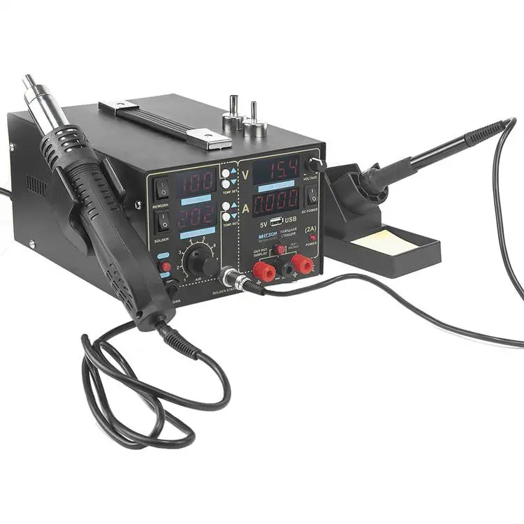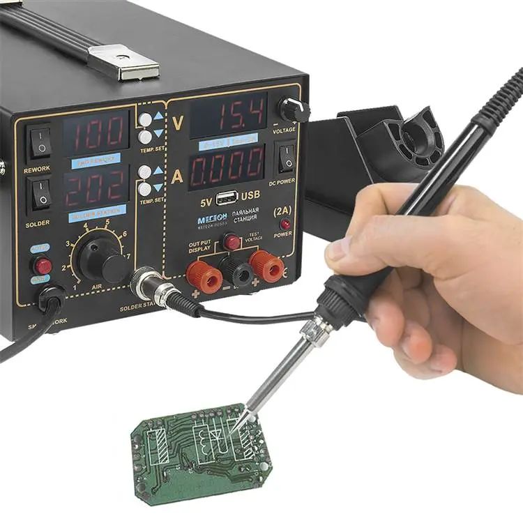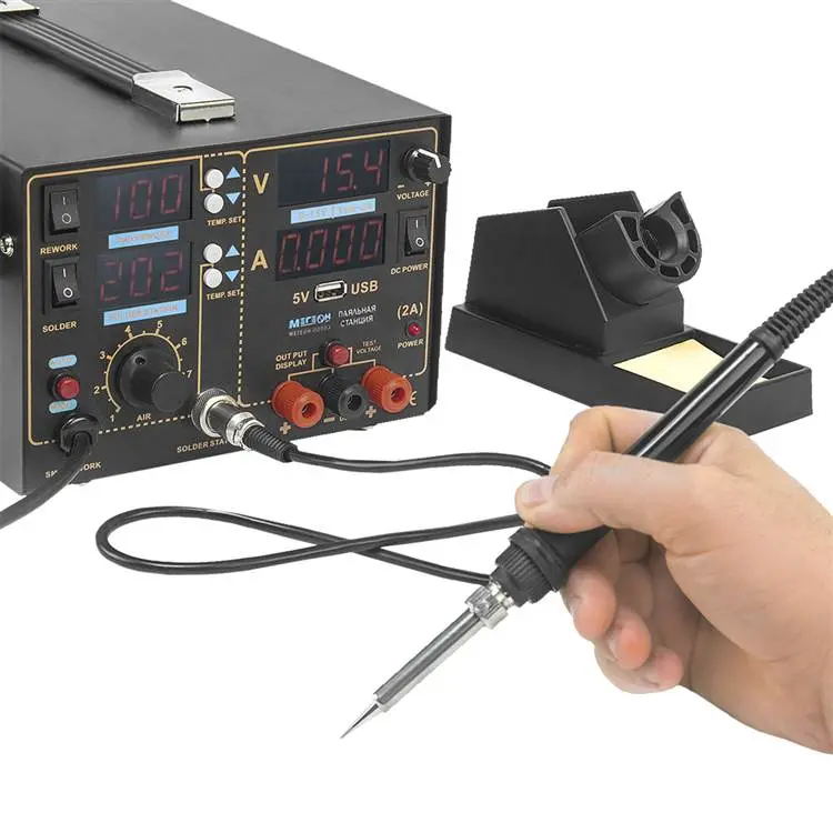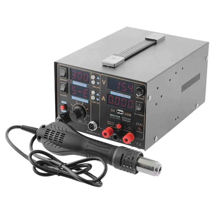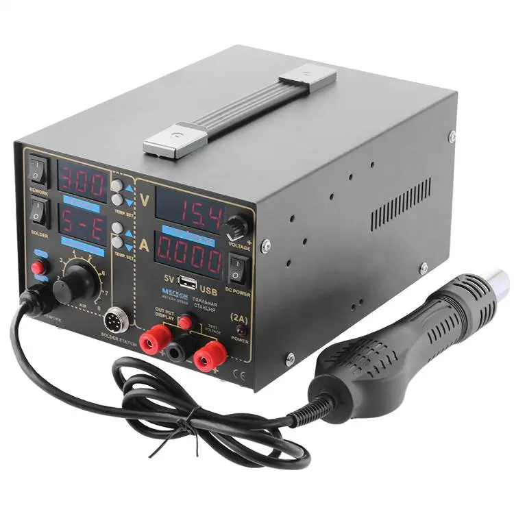 Многофункциональная паяльная станция 3 в 1 МЕГЕОН 00503 объединяет в себе функции термофена, паяльника и двухканального источника питания, что делает его незаменимым помощником как для профессионалов, так и для любителей.