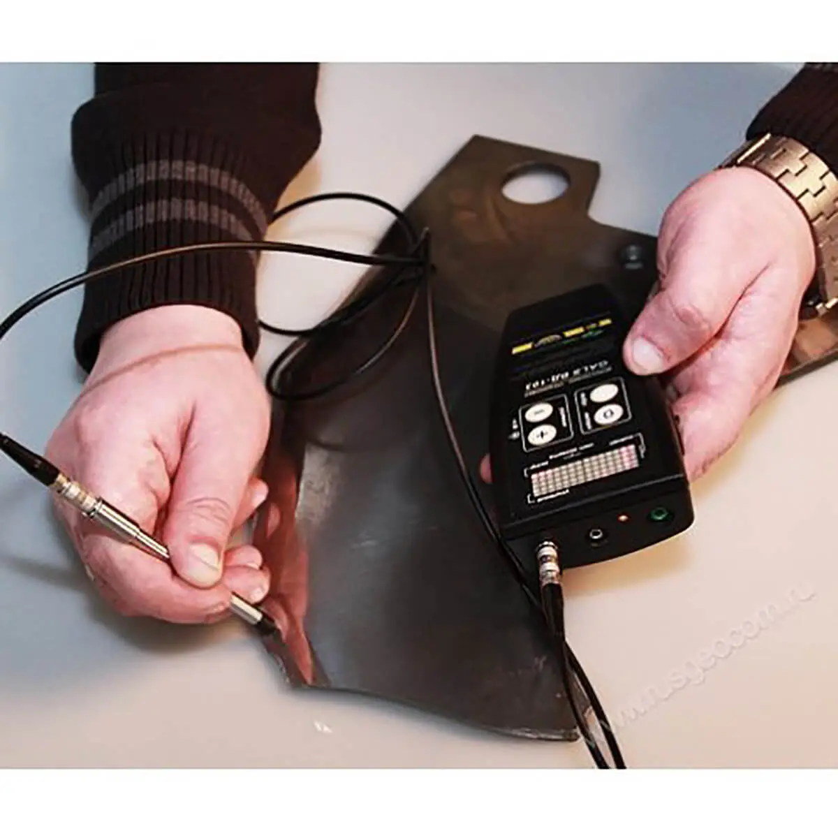 Работа с различными типами преобразователей реализована в дефектоскопе-трещиномере АКА-Скан ГАЛС ВД-103. Благодаря этому, вы можете проводить измерения в труднодоступных местах или бесконтактным способом, если того требуют, например, меры безопасности.