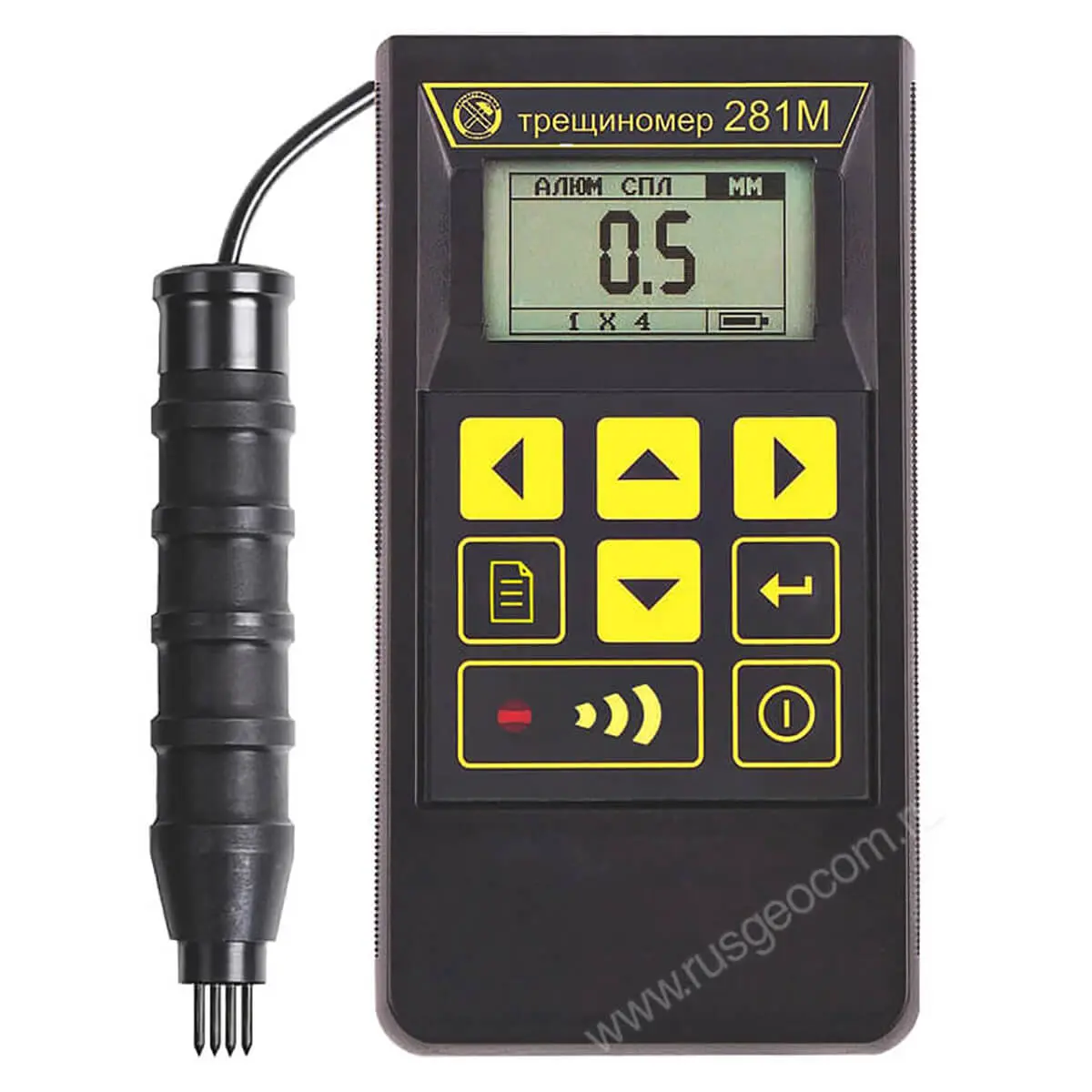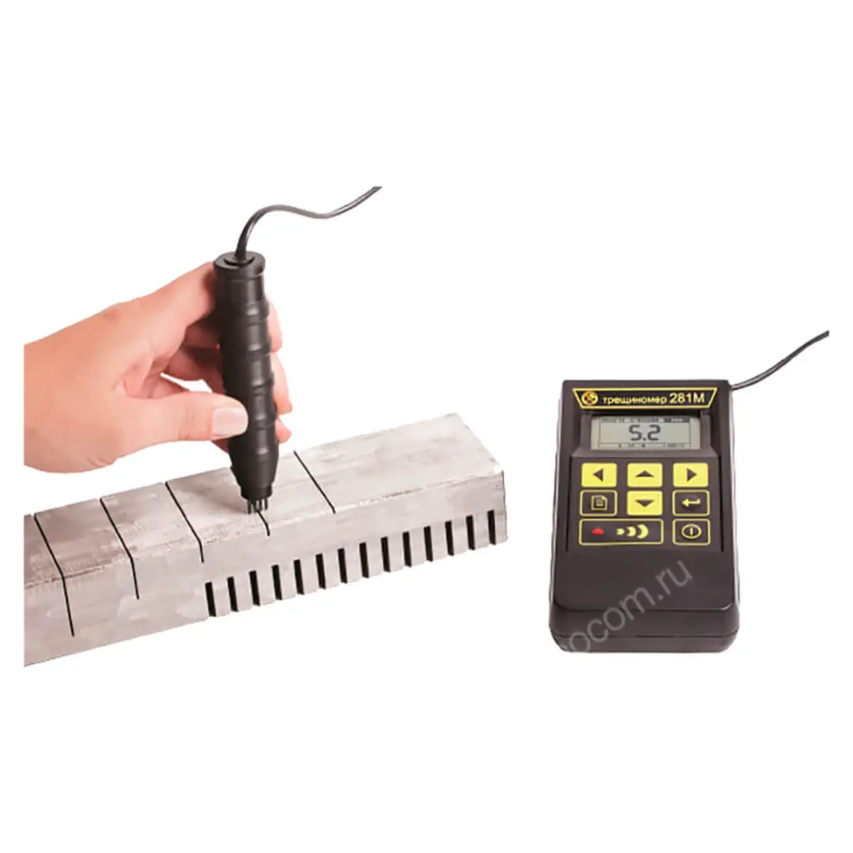 Через электроды выносного датчика электропотенциальный трещиномер 281М подает высокочастотный ток заданного номинала на поверхность объекта контроля и фиксирует разницу потенциалов, возникающую на стенках трещины, которая пропорциональна глубине дефекта. Микропроцессорным блоком производится обработка сигнала с учетом констант для конкретных материалов. Вычисленный цифровой результат отображается на дисплее в миллиметрах или в другой системе единиц, в соответствии с пользовательскими настройками. Для исключения влияния электромагнитных свойств материала на показания прибора, перед замером выполняется отстройка измерителя на бездефектном участке поверхности объекта контроля.