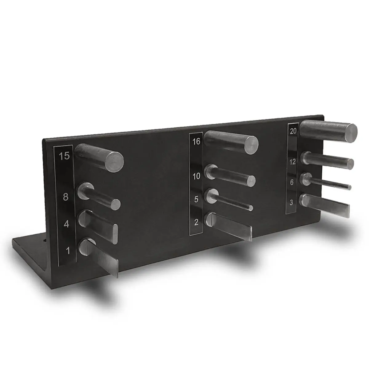 Контрольно-измерительный прибор представляет собой прочную чугунную Г-образную основу, на которой надежно зафиксированы набор металлических стержней различного диаметра (от 1 до 20 мм). Каждый стержень маркирован, что упрощает процесс измерения и документирования результатов. Набор включает как цилиндрические, так и плоские стержни с закругленными вершинами, позволяя проводить испытания с учетом специфики исследуемого покрытия. Такой подход гарантирует точность результатов и адаптирует прибор к различным стандартам и видам покрытий.