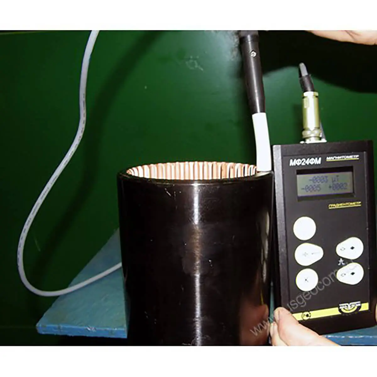 Для быстрой настройки измерителя, с точной установкой нулевого показателя, с учетом местных условий выполнения работ и компенсацией наводок и помех, магнитометр АКА-Скан МФ-24ФМ комплектуется калибровочным устройством.