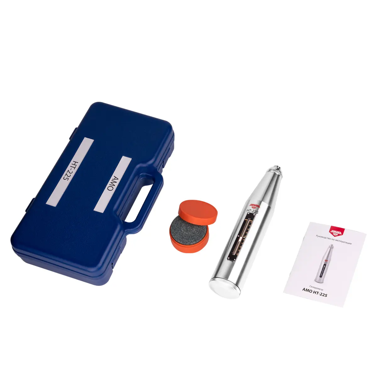 В приложении к руководству по эксплуатации, поставляемом вместе с прибором, приведена таблица, в которой установлена зависимость прочности исследуемого материала от величины отскока для разных направлений удара. Благодаря этому склерометр AMO HT-225 обеспечивает автоматический учет погрешности, вносимой из-за влияния силы тяжести, за счет чего гарантируется точность результатов при измерениях на поверхностях с различным уклоном. Для удобства считывания результатов измерений предусмотрена возможность блокировки положения шкалы инструмента после отскока с помощью кнопки-стопора. Обнуление измерителя выполняется автоматически под действием компрессионной пружины при выдвижении индентора в переднее положение.
