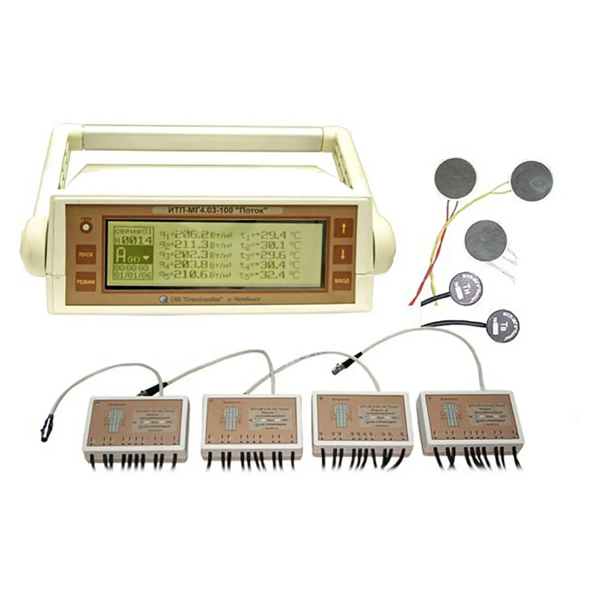 Непосредственно замеры выполняются при помощи десяти программируемых модулей, к которым может быть подключено от 1 до 10 датчиков-измерителей (конфигурирование каналов модуля выполняется по заказу). Программирование модулей, а также считывание собранной ими информации выполняет электронный блок (к которому могут подключаться 10 модулей одновременно). Полученные результаты измерений в последующем могут передаваться на компьютер через специальный кабель (поставляется в комплекте).