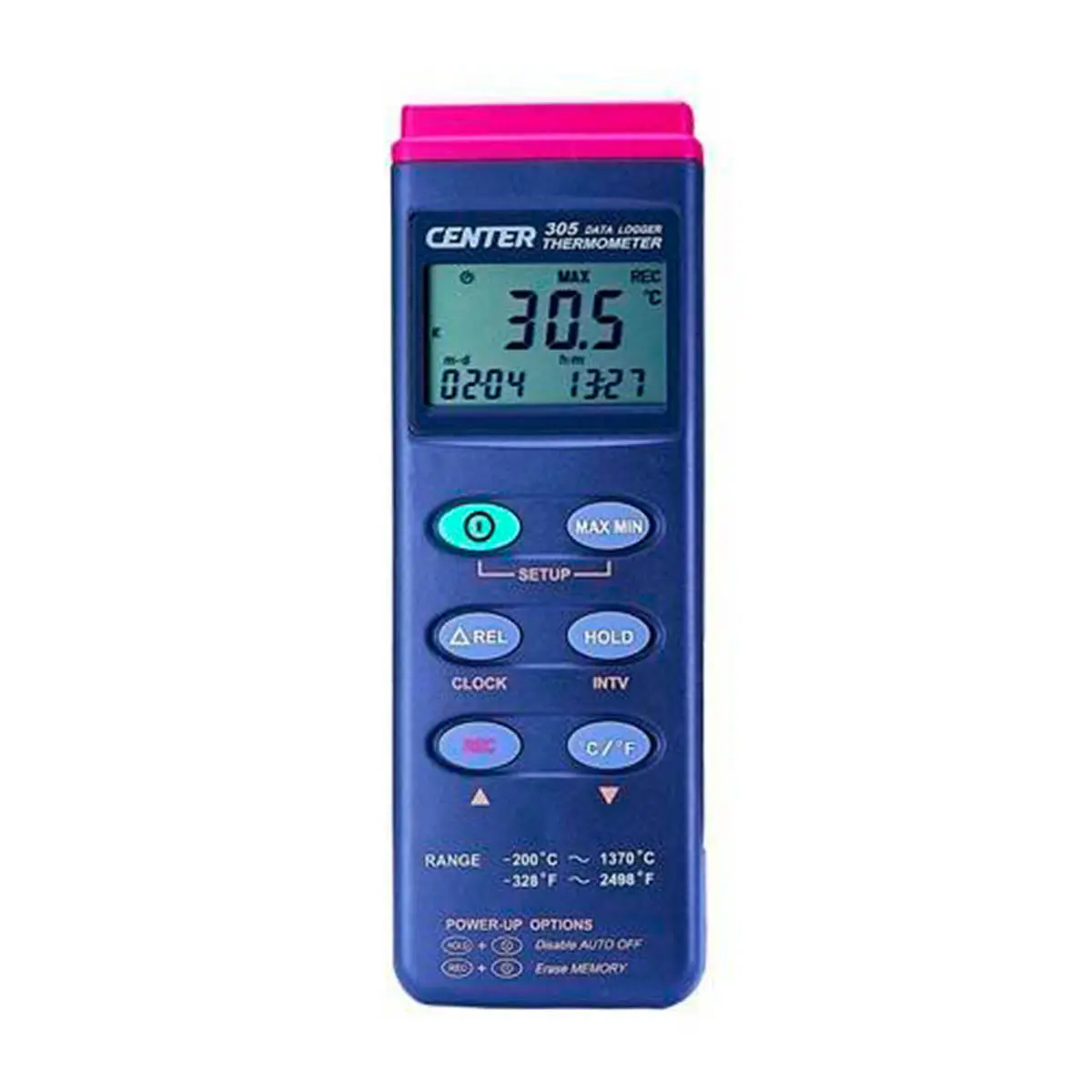 Термометр Center 305 имеет разъем для подключения внешнего зонда и предназначен для работы с термопарой типа К. Прибор оснащён секундомером и позволяет определять среднее, максимальное и минимальное измеренное значение. Показания удерживаются на экране после завершения замеров.