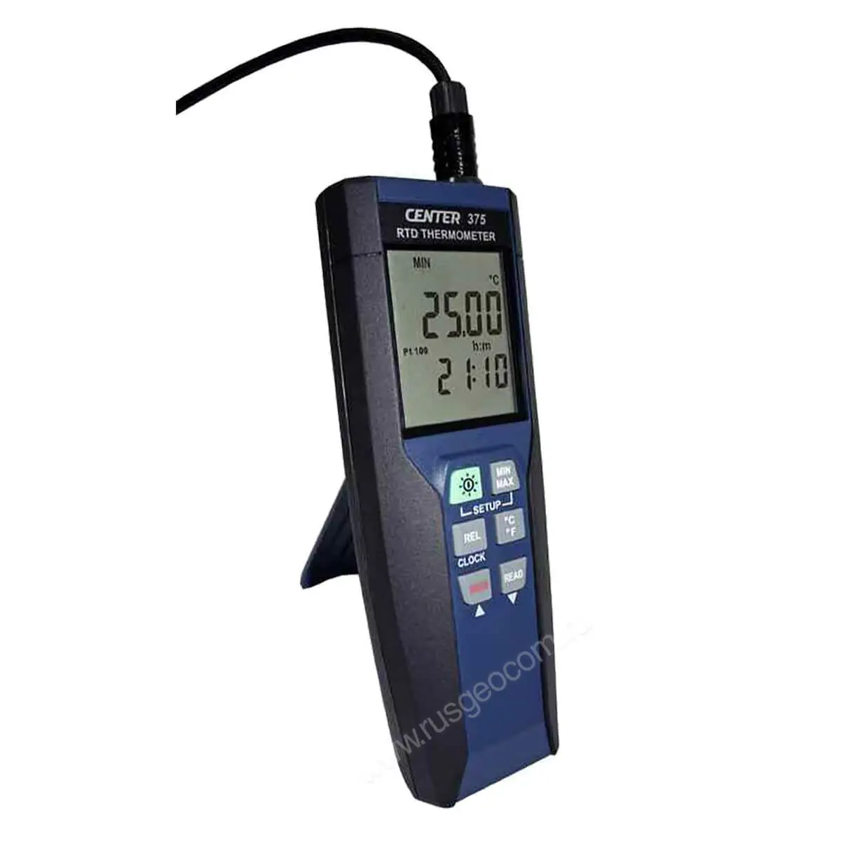 В комплекте с CENTER 375 поставляется четырехпроводной платиновый термопреобразователь Pt-100, длинный кабель и небольшой диаметр зонда которого помогают проводить измерения в труднодоступных местах. Термометр также поддерживает датчики Pt-500 и Pt-1000.