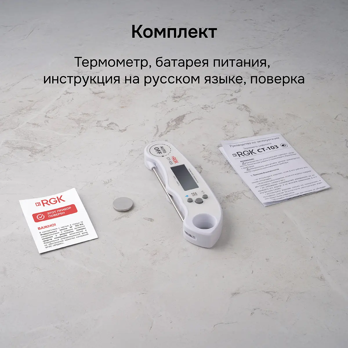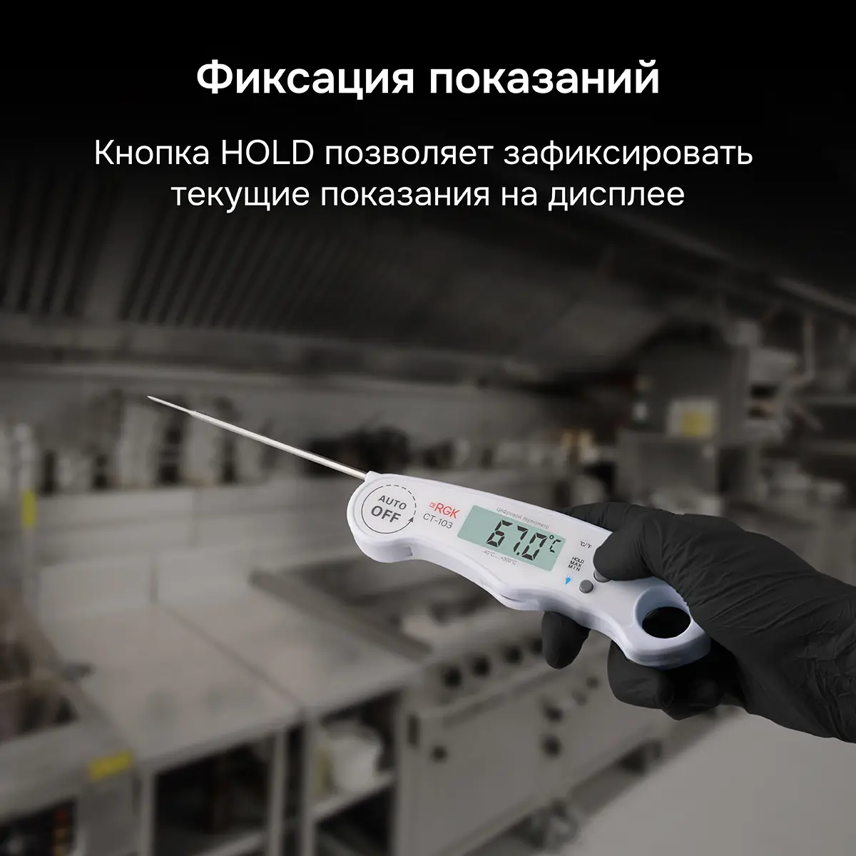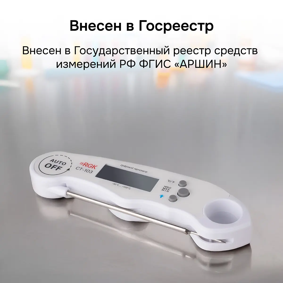 Термометр цифровой RGK CT-103 представляет собой контактный измеритель с тонким погружным зондом в оболочке из нержавеющей стали, предназначенный для контроля внутренней температуры жидкостей и суспензий, вязких и сыпучих материалов, пищевой продукции и т.п. Подобно модели CT-3, данное изделие выполнено в складывающемся форм-факторе, что обеспечивает удобство и безопасность его переноски в кармане, исключая риск случайного повреждения измерительного сенсора и травмирования персонала, поддерживая при этом больший перечень функций и обладая расширенным измерительным диапазоном.