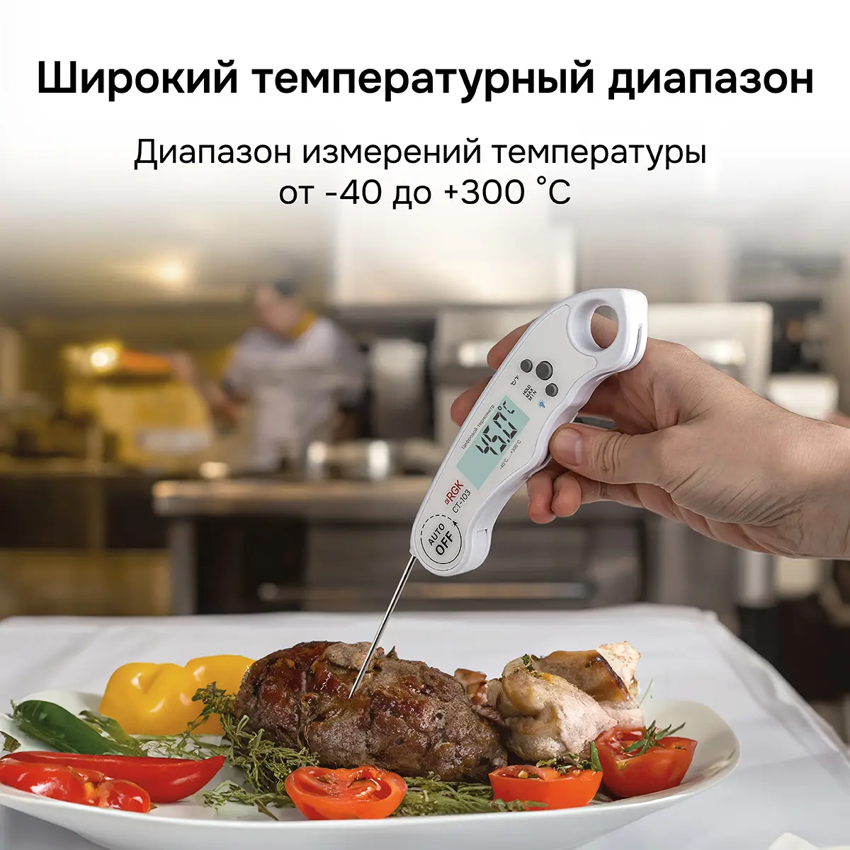 По классу пыле- и влаго-защиты термометр соответствует категории IP66, благодаря чему при загрязнении прибор можно мыть под струей воды. Измерительный зонд изделия диаметром 3,5 мм и длиной 113,4 мм заужен в передней части до 1,7 мм. За счет этого при проверке внутренней температуры кулинарной продукции не портится ее внешний вид.