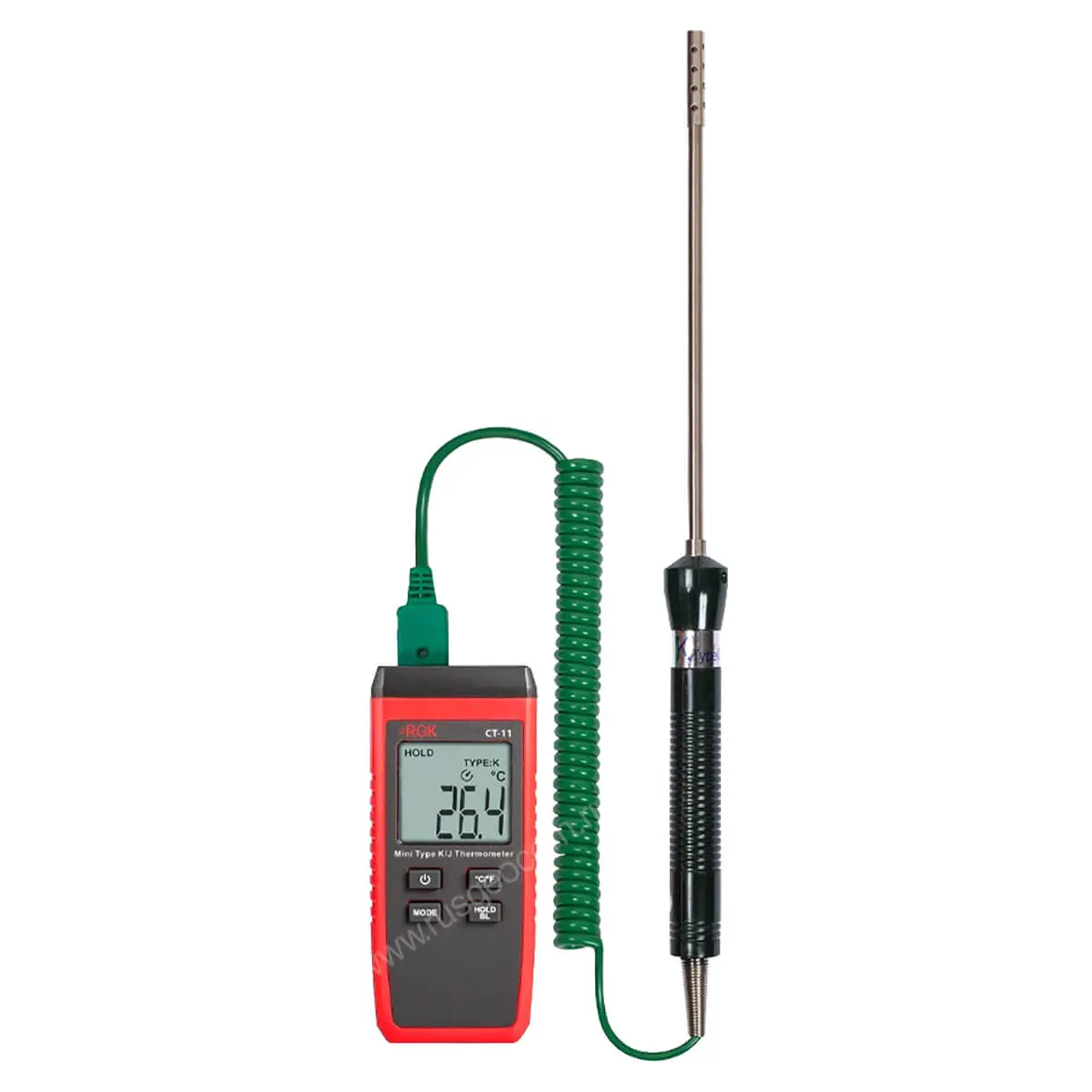 В базовом исполнении одноканальный контактный термометр RGK CT-11 с зондом температуры воздуха TR-10A измеряет температуру в диапазоне от - 40 °С до + 260 °С с погрешностью не более ± 1,5 °C. Контактный способ работы позволяет точно определить температуру любой поверхности, жидкости или газа.