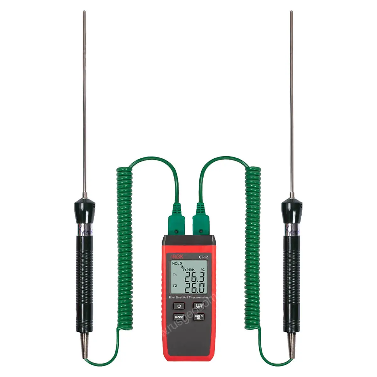 За счет небольшого веса компактный двухканальный цифровой термометр RGK CT-12 с погружными зондами температуры TR-10W удобен для проведения длительных инспекций в полевых условиях, легко помещается в карман одежды или сумки. С большого дисплея показания считываются легко и без путаницы между каналами. Корпус прибора выполнен из прочного пластика, снабжен рельефными участками для надежного захвата и выдерживает падение с метровой высоты.