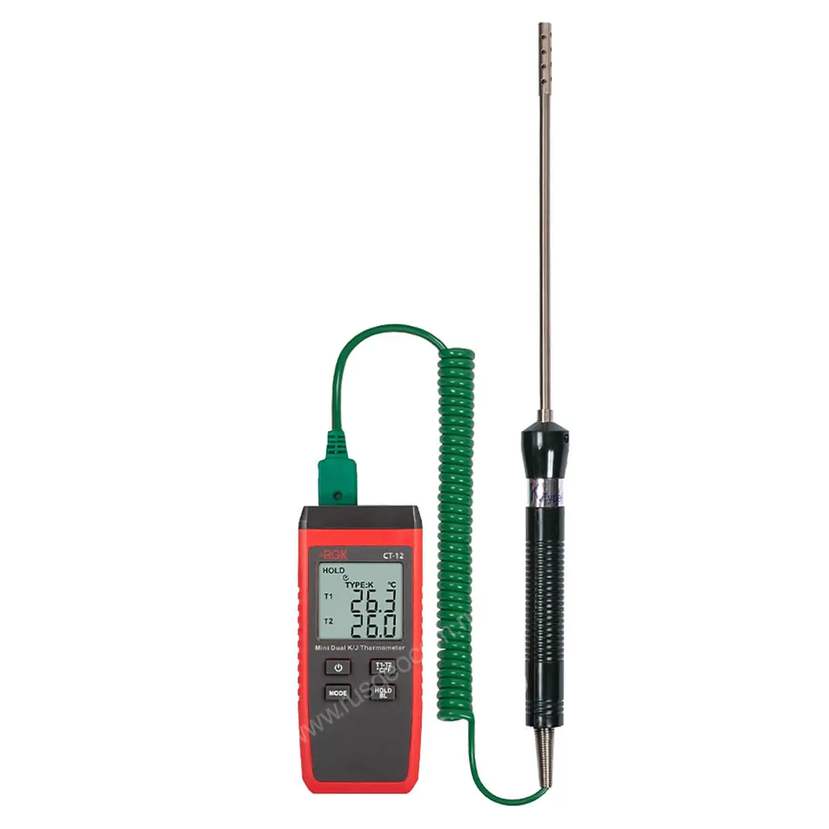Контактный термометр RGK CT-12 с зондом температуры воздуха TR-10A - это надежный и точный прибор для измерения температуры в диапазоне от - 40 °С до + 260 °С с комплектной термопарой. Погрешность при этом составляет не более ± 1,5 °C. Главное преимущество этой модели - 2 гнезда для подключения выносных датчиков с функцией определения разности между каналами. Благодаря такой конфигурации можно быстро и удобно решать множество измерительных задач, связанных с диагностикой и настройкой электроники, промышленного оборудования, систем отопления и вентиляции т.п.