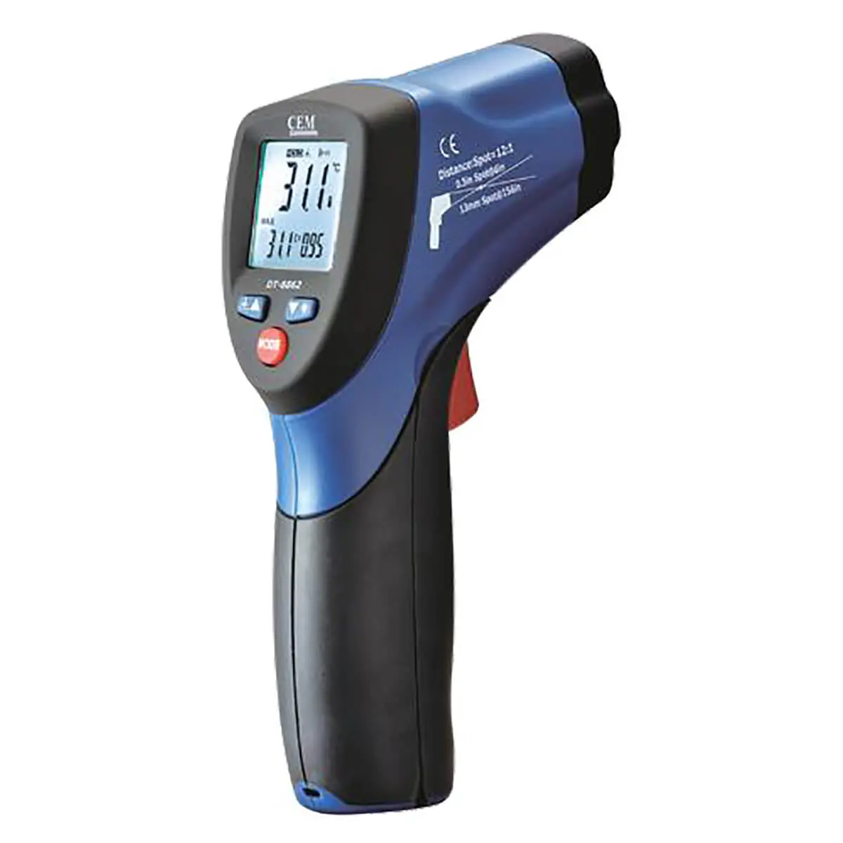 Время отклика пирометра CEM DT-8862 не превышает 150 мс, что соответствует стандартам высокоскоростных термометров. Оптическое разрешение 12:1 позволяет проводить измерения в горячих зонах и труднодоступных местах. Двойной лазерный целеуказатель позволяет точно определить границы исследуемого участка на поверхности объекта.
