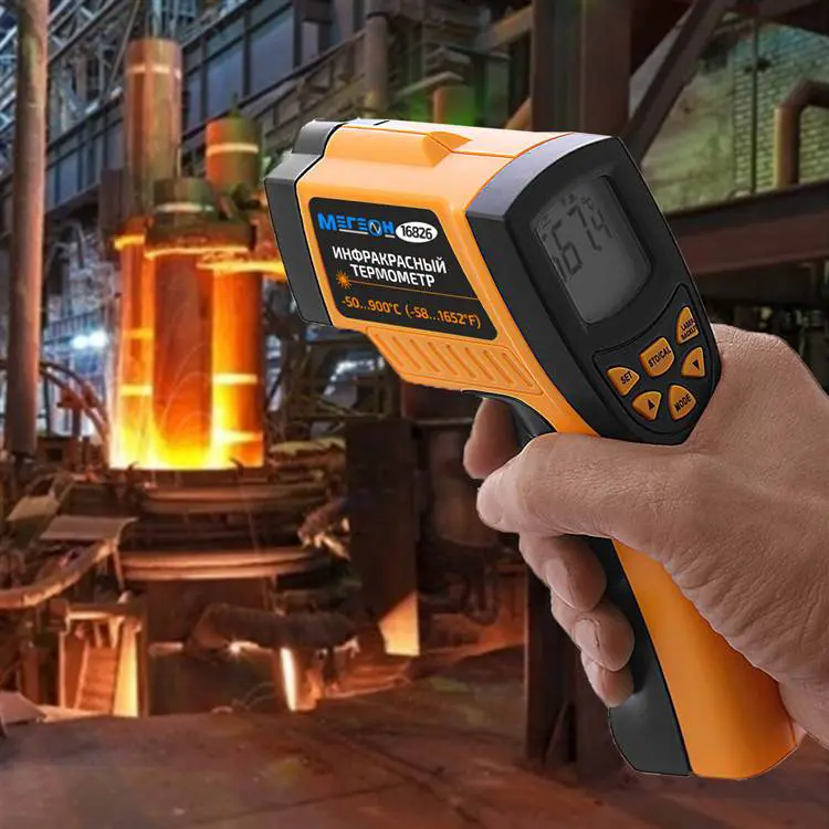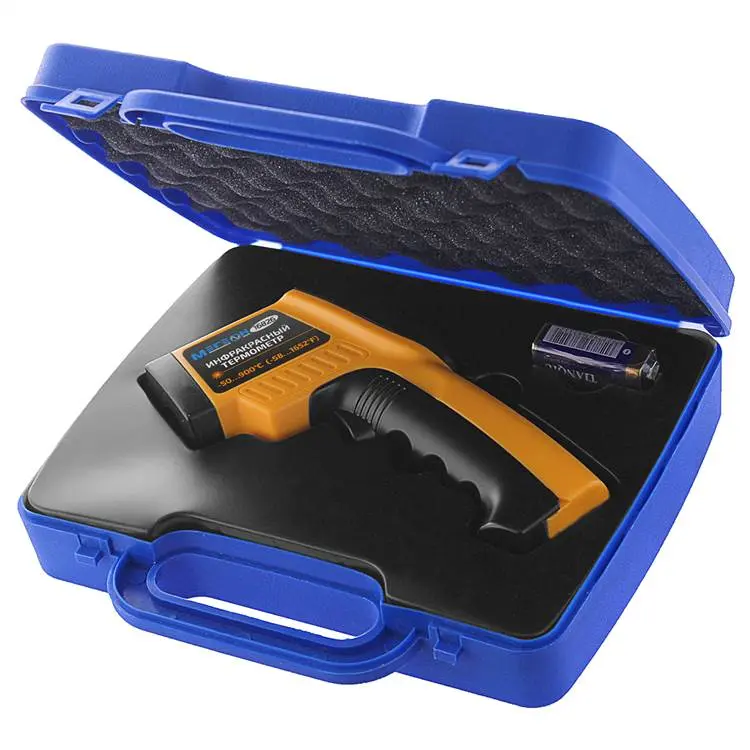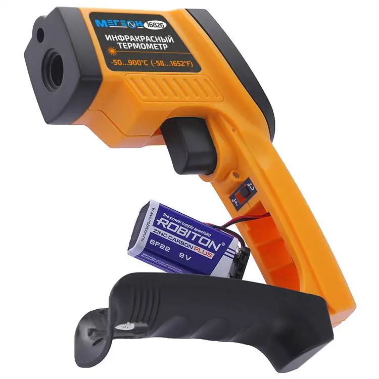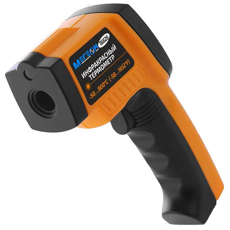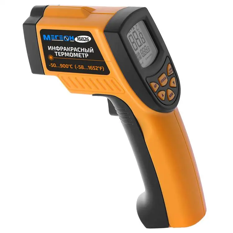 ИК-термометр - пирометр МЕГЕОН 16826 отличается широким измерительным диапазоном, от –50 до +900°С, благодаря чему подходит для применения в промышленных отраслях, и может использоваться как для разовых замеров, так и для продолжительного непрерывного сканирования, обеспечивая обследования крупных сложных объектов. Инструмент выполнен в пистолетном форм-факторе, с эргономичным размещением кнопок управления, и обладает небольшим весом, всего 210 г с батареей питания. За счет этого изделием удобно пользоваться одной рукой, что упрощает выполнение замеров из неудобных положений и в труднодоступных местах.