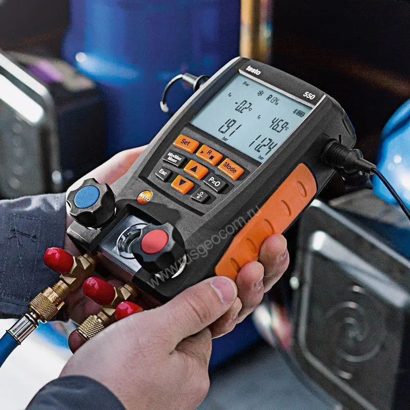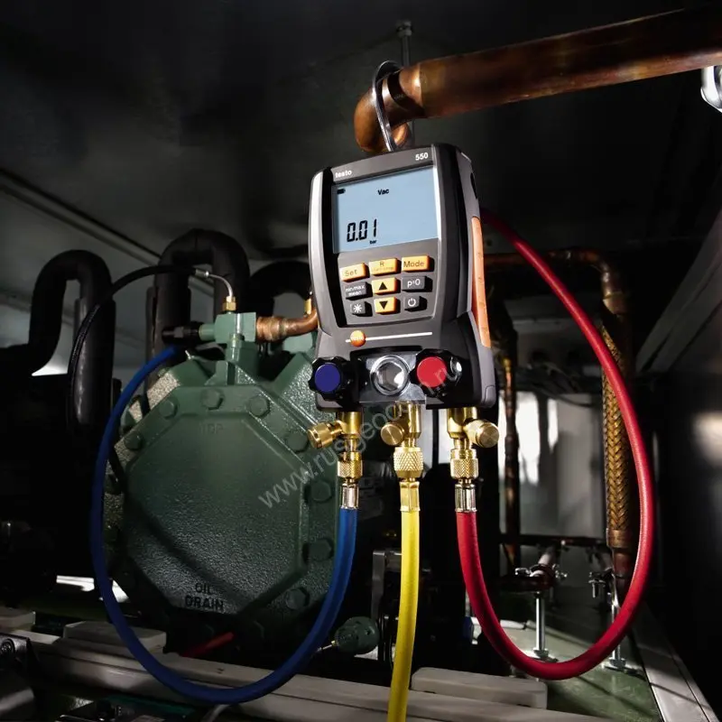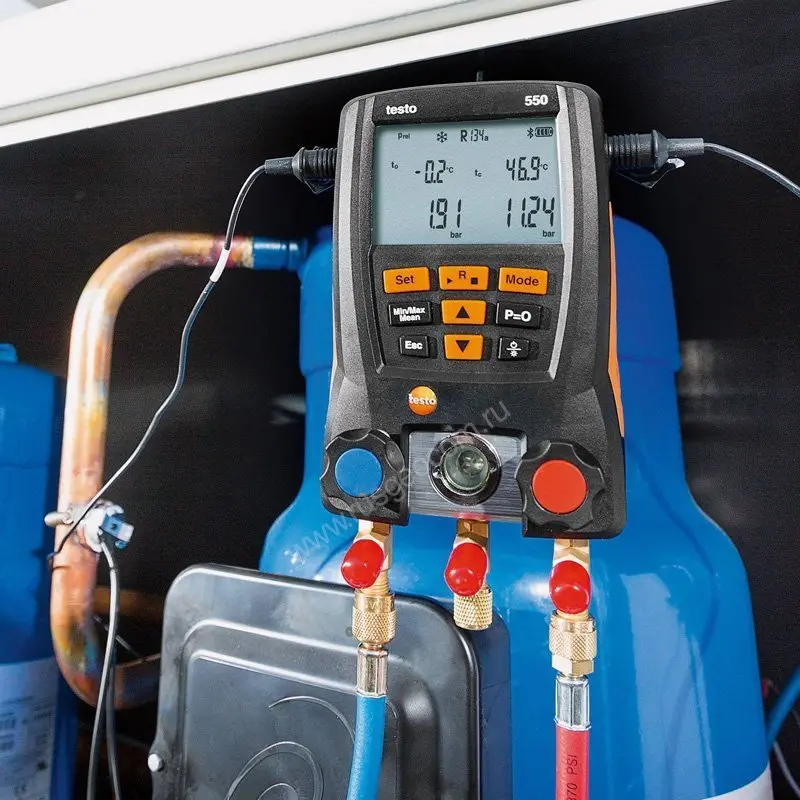 Манометрический коллектор Testo 550 используется специалистами по наладке и ремонту холодильного и отопительного оборудования. Он позволяет измерять температуру циркулирующего хладагента и давление в контурах охлаждения.