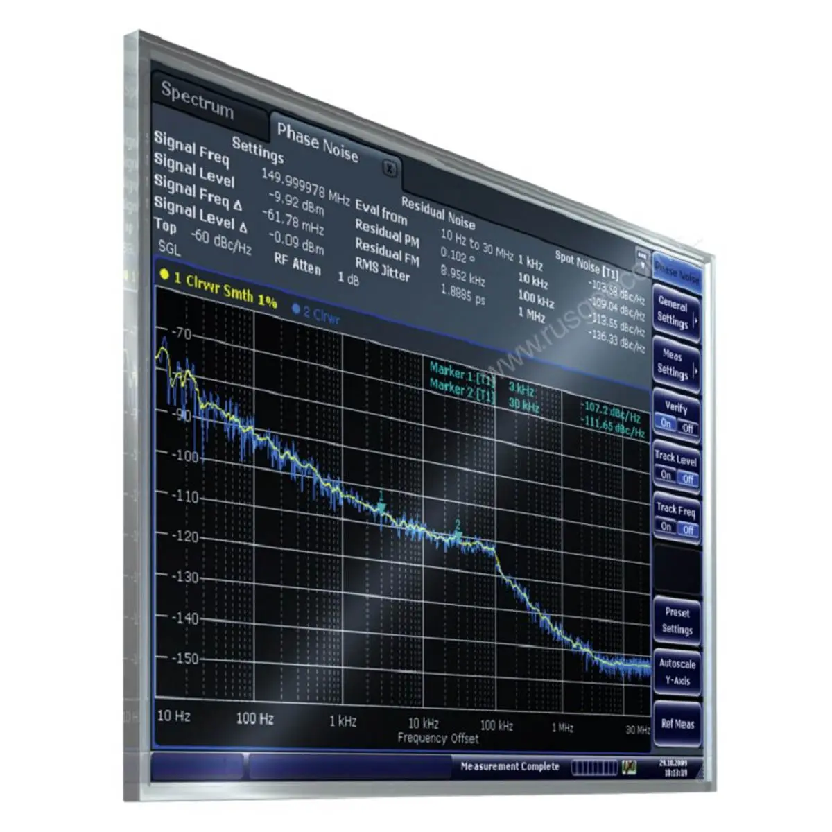 Оснащенные опцией R & S®FSV-K40, анализаторы R & S®FSV и R & S®FSVA могут измерять фазовый шум в одной боковой полосе в выбранном диапазоне частот смещения несущей с логарифмическим отображением диапазона смещения. На основании измеренного фазового шума пользователь также может определить остаточную FM / PM и джиттер.