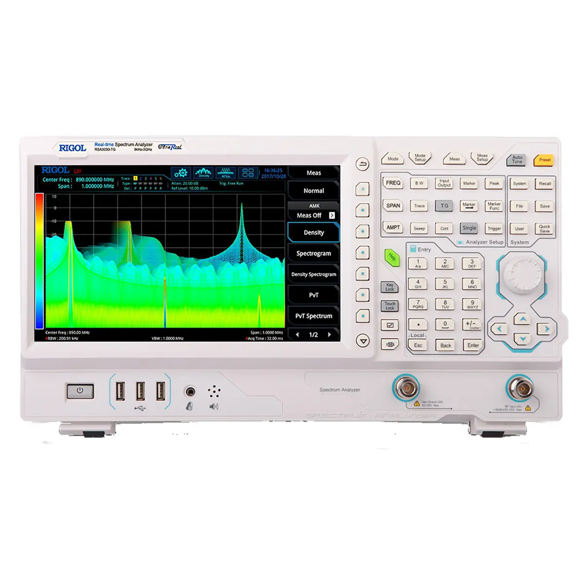 Оснащенный цифровым фильтром ПЧ, анализатор спектра при выполнении измерений по супергетеродинному принципу сканирует диапазон частот, позволяя выявлять близко расположенные сигналы в частотном поле на фоне паразитных помех. Параллельное сканирование в реальном времени обеспечивает полосу анализа в базовом варианте 10 МГц, с поддержкой опционального расширения до 40 МГц – подобно старшей серии RSA5000. За счет высокого быстродействия обеспечивается целостность данных и исключается случайный пропуск редких событий. Доступна синхронизация по маске с заданием индивидуального шаблона. Прибор поддерживает аналоговую демодуляцию, с возможностью воспроизведения акустического сигнала через подключаемые наушники.