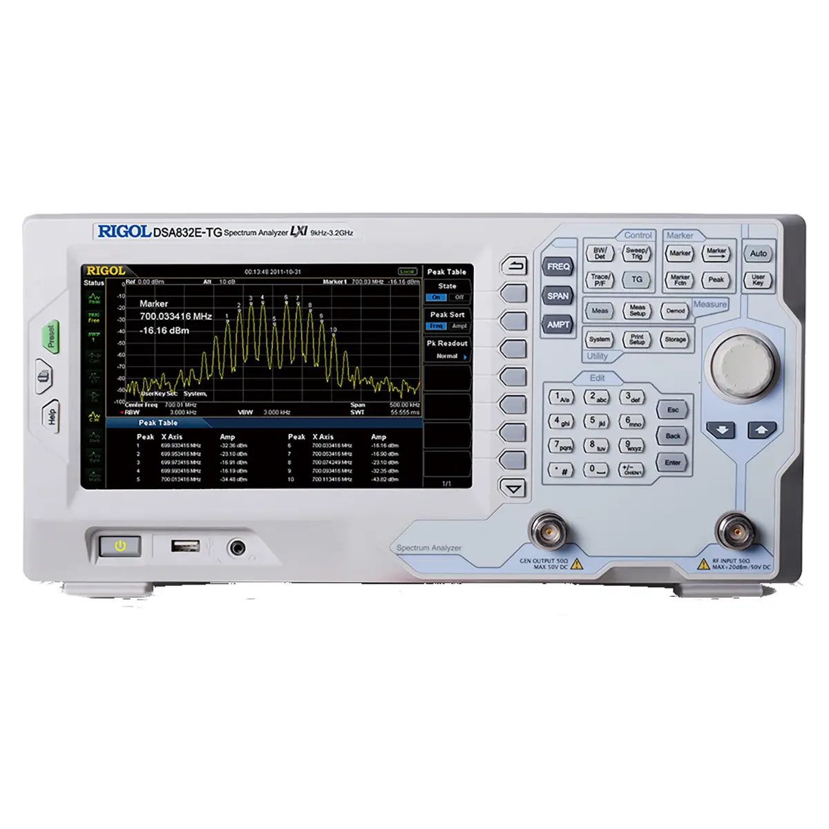 Настольный анализатор спектра RIGOL DSA832E-TG снабжен кнопочным интерфейсом с комбинированной подсветкой и 8-дюймовым дисплеем высокого разрешения. Отображение на экране до 4 спектрограмм с цветовой дифференциацией, которые можно обрабатывать с помощью разных функций, дает возможность одновременно отслеживать разные параметры сигнала, определяя среднюю мощность, максимальные и минимальные значения и т.п., а также выполнять математические действия между кривыми и константами, что повышает эффективность визуального анализа. В процессе измерений на дисплей также выводятся пиктограммы, которые информируют о текущих статусах измерителя, цифровые данные выбранных установок и получаемых результатов измерений, и т.д.