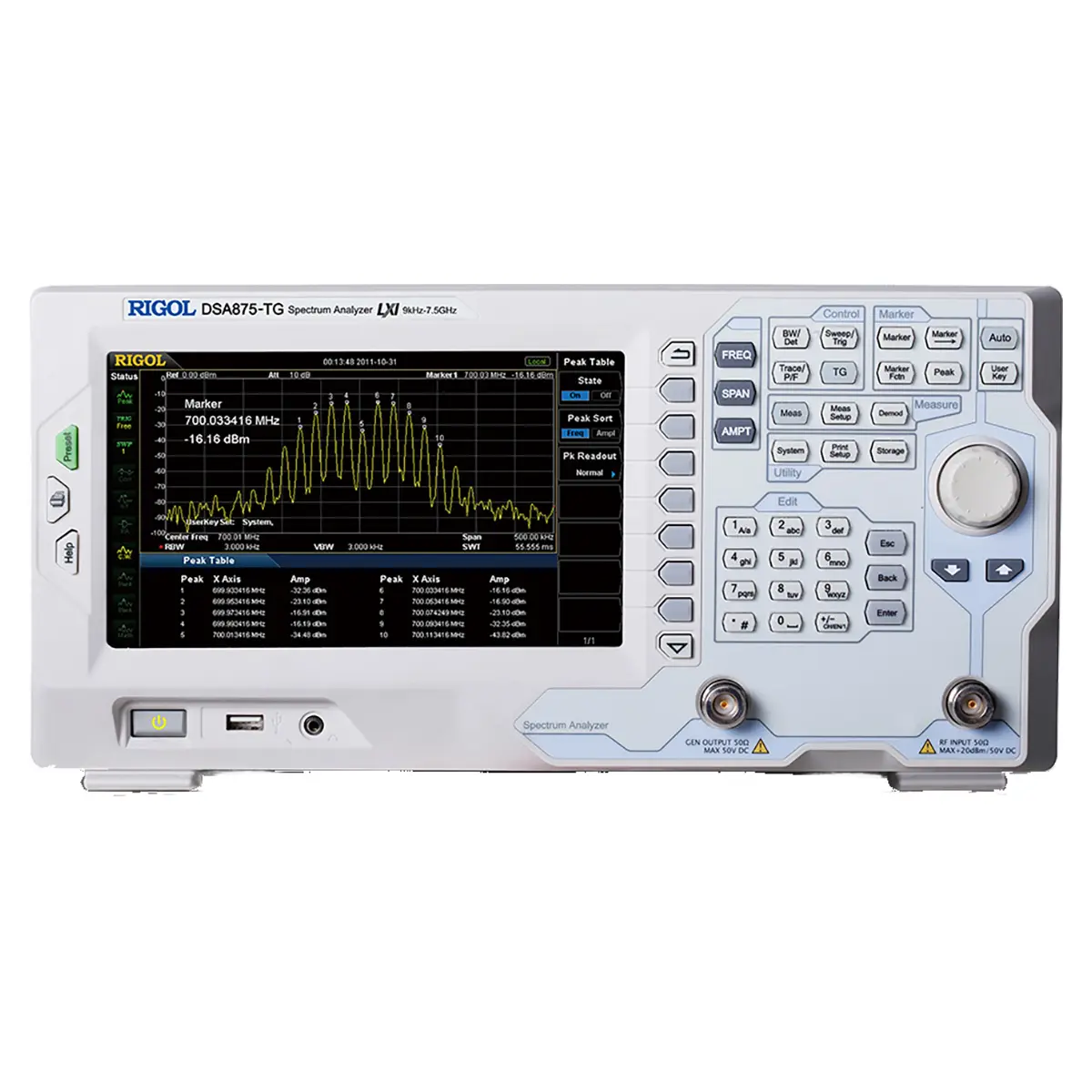 Анализатор спектра RIGOL DSA875-TG с трекинг-генератором является старшей моделью в семействе лабораторных настольных приборов, которая позволяет исследовать амплитудные и фазовые параметры различных объектов контроля, в том числе коммуникационного оборудования и радиотехнических устройств в полосе частот до 7,5 ГГц в ходе их разработки и отладки. С целью снижения стоимости целый ряд измерительных режимов, реализованных в серии DSA1000A стандартно, в данной модели предлагается в качестве дополнительных аппаратных и программных опций. Благодаря этому при покупке базового варианта не придется переплачивать за функции, которые могут оказаться невостребованными, но поддерживается возможность их добавления в последующем по мере необходимости.