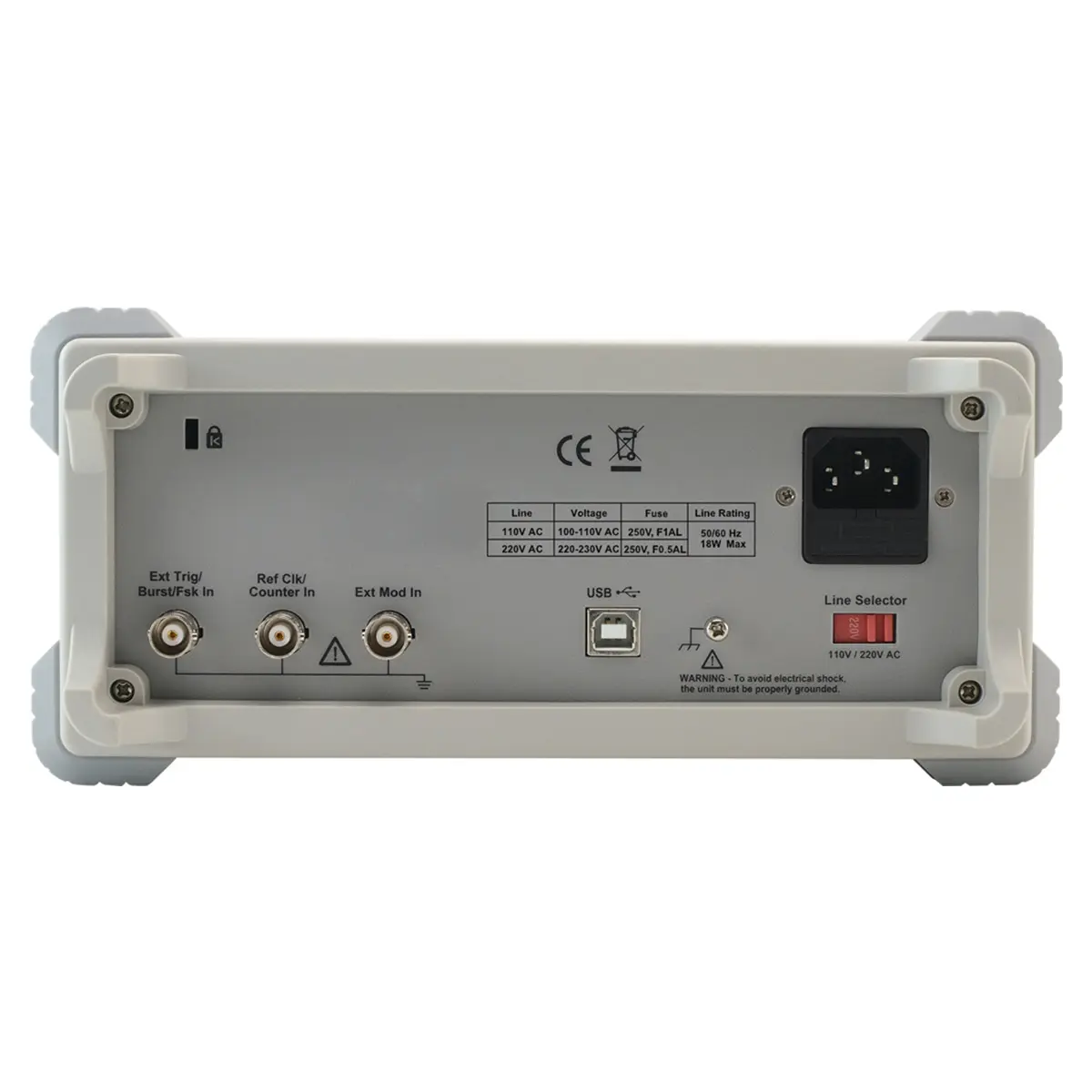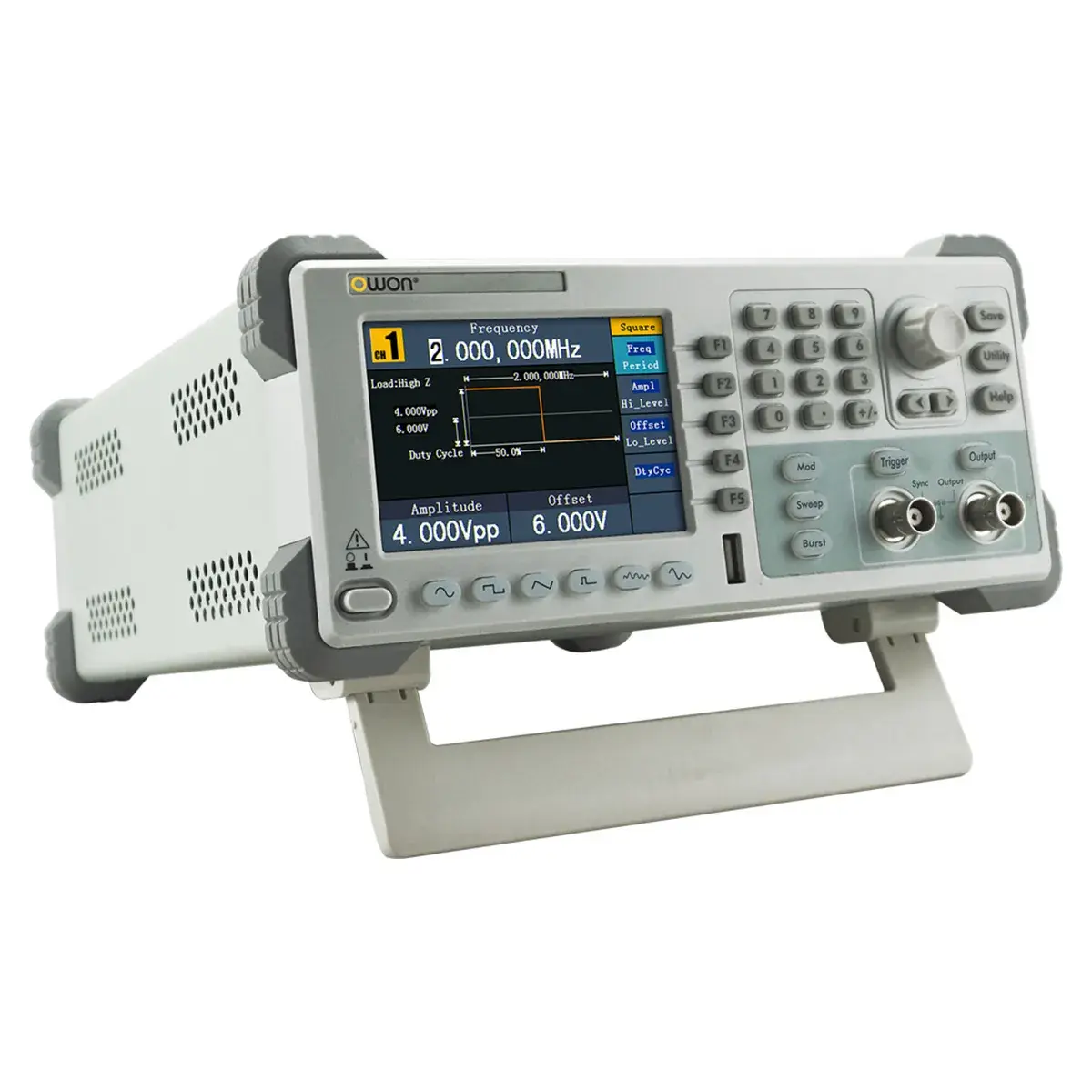 Генератор сигналов OWON AG051F – лабораторный многофункциональный прибор бюджетной категории, оборудованный одним рабочим каналом и способный воспроизводить 5 стандартных и 45 произвольных типов сигналов в полосе частот до 5 МГц, реализуя технологию прямого цифрового синтеза. F-модификация, в отличие от базового варианта, способна выполнять наложение разных видов модуляции и свипирования, реализует пакетный режим, а также оборудуется встроенным частотомером и расширенным набором входов для внешней модуляции, развертки и синхронизации. Для связи с ПК, при использовании прибора в режиме дистанционного управления, служит USB порт, а в базовый комплект поставки включен соответствующий кабель и ПО с драйверами на диске.