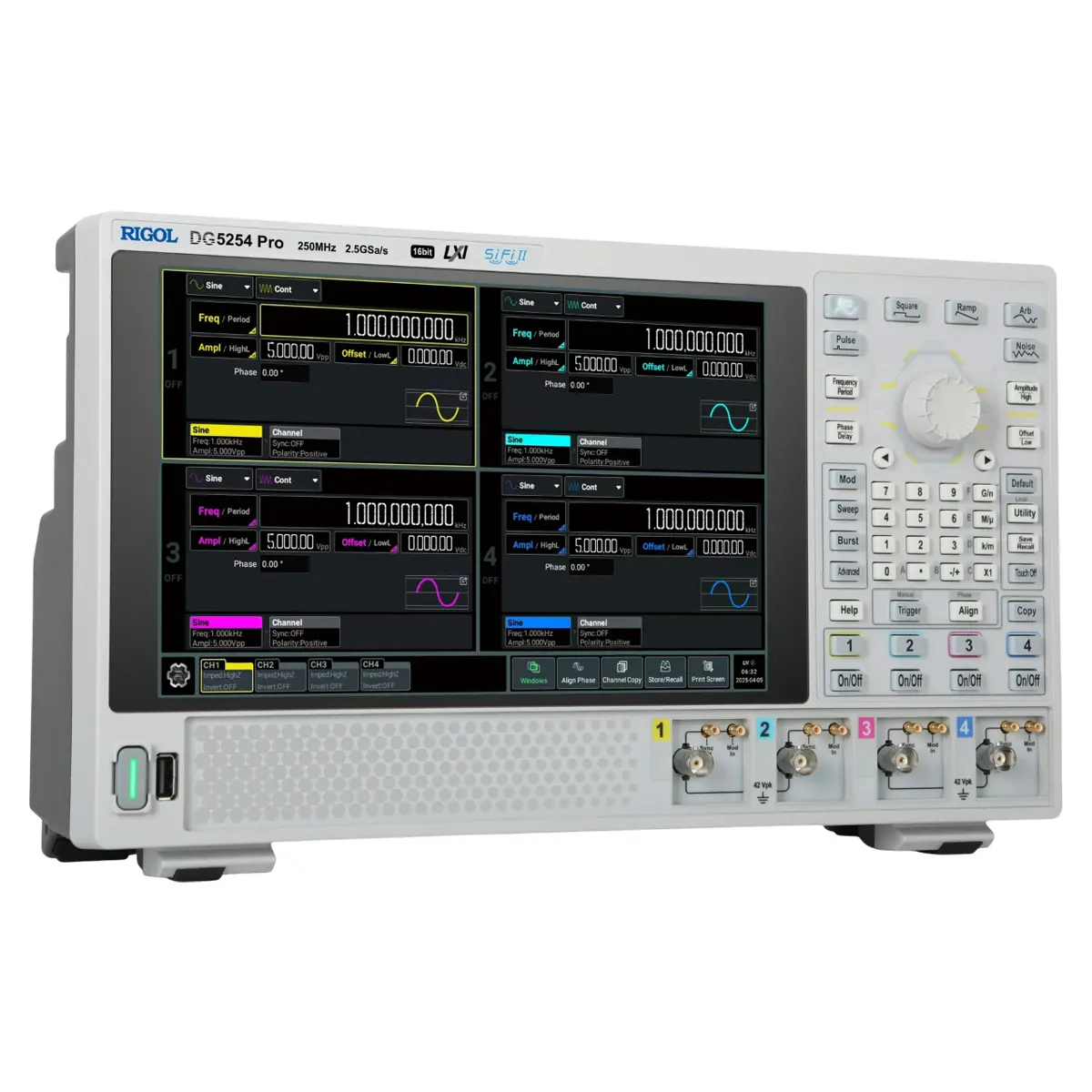 С целью минимизации шумов и наводок, в том числе от контура заземления, с точной синхронизацией и обеспечением стабильности сложных сигналов при работе с многоканальным оборудованием, генератор RIGOL DG5254 Pro поддерживает попарное объединение соседних каналов в изолированные между собой и от общего шасси группы. Каждый канал снабжен собственным входом для внешней модуляции и выходом для синхронизации с коннекторами SMB. Изделие оборудовано цветным сенсорным дисплеем с диагональю 10,1 дюйма и набором интерфейсов для интеграции с другим оборудованием, за счет чего обеспечивается гибкость управления.