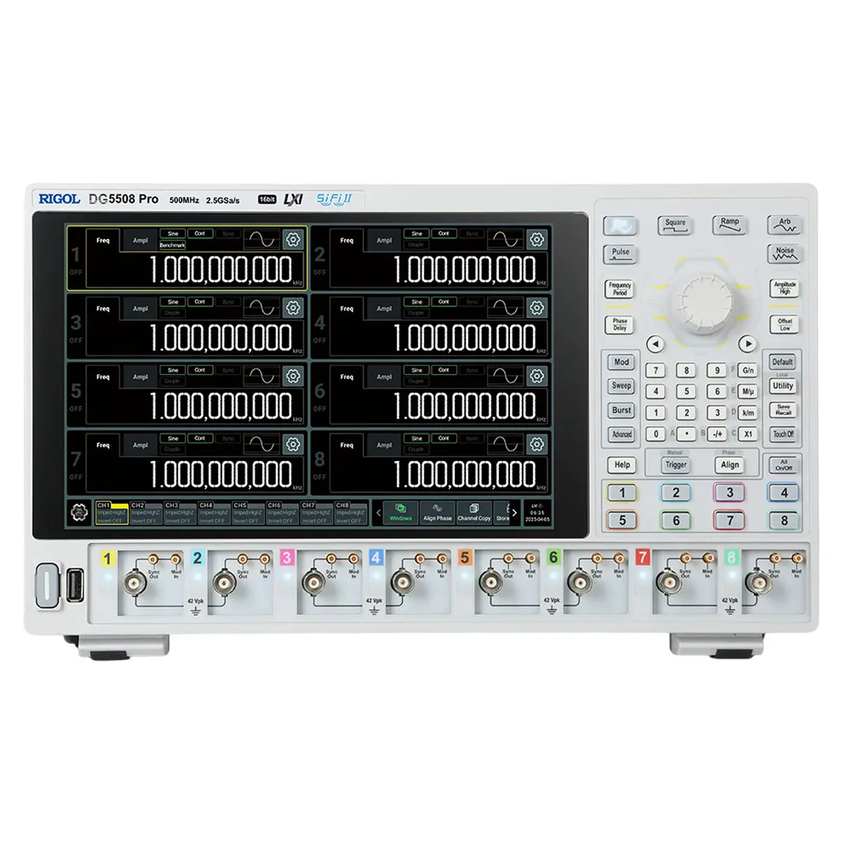 Генератор сигналов произвольной формы RIGOL DG5508 Pro – 8-канальный прибор в настольном исполнении, с полосой пропускания 500 МГц, обладающий высокой производительностью за счет 16-битного вертикального разрешения и лучшей в своём классе частоты дискретизации, до 2,5 Гвыб/с. Изделие способно моделировать стандартные функции и произвольные формы, реализуя технологию поточечного формирования Signal Fidelity II, с двойной фильтрацией и интерполяцией. За счет высокой точности межканальной синхронизации, устройство способно реализовать сложные сценарии, например, выдавать наборы когерентных сигналов при тестировании многоканального оборудования: фазированных решеток, MIMO-систем и т.п.
