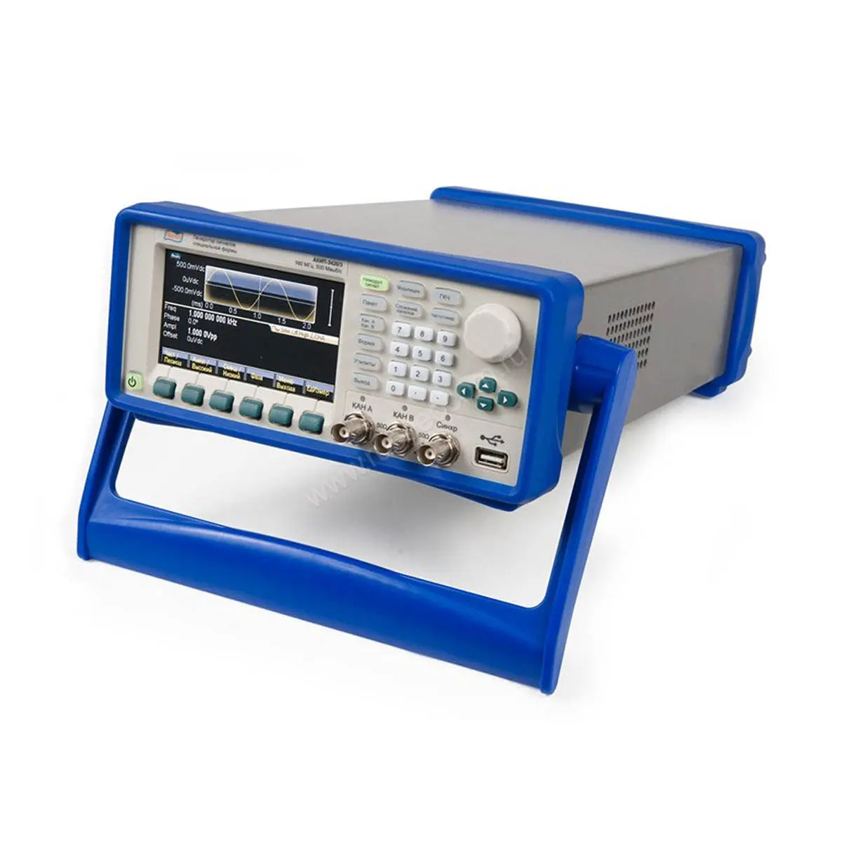Для управления прибором используются кнопки на панели , отображение информации производится на 11-см жидкокристаллическом экране. На корпусе имеются интерфейсы USB – 2 штуки и сетевой разъем для подключения компьютера и удаленного управления генератором при помощи ПО на компьютере.