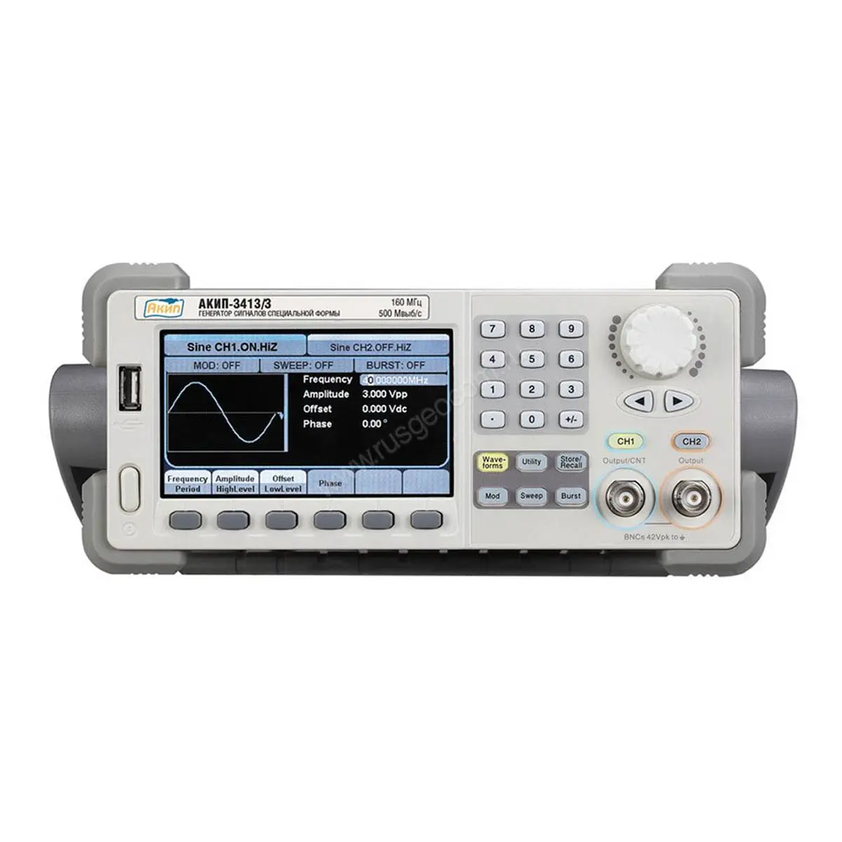 Генератор имеет собственные органы управления и дисплей для вывода информации. В стандартной комплектации генератор сигналов специальной формы АКИП-3413/2 имеет порт USB для подключения внешних устройств управления. По индивидуальному заказу прибор может быть оборудован сетевым интерфейсом, а также GPIB.