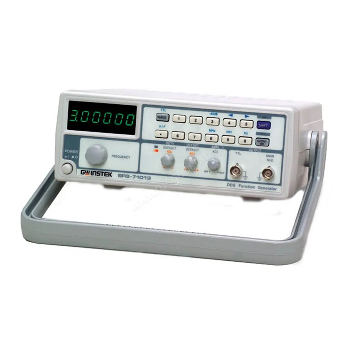 Портативный генератор специальных сигналов GW Instek SFG-71013 снабжен кнопочной панелью и отдельными регулировочными верньерами, что ускоряет и упрощает задание требуемых выходных параметров. Выбор размерности между Гц, кГц или МГц выполняется прямым методом, путем нажатия соответствующих кнопок. Контроль частоты производится по показаниям цифрового индикатора. Возможно задание постоянного смещения, а при генерировании сигнала “меандр” поддерживается возможность регулировки скважности, что расширяет диагностические возможности прибора.