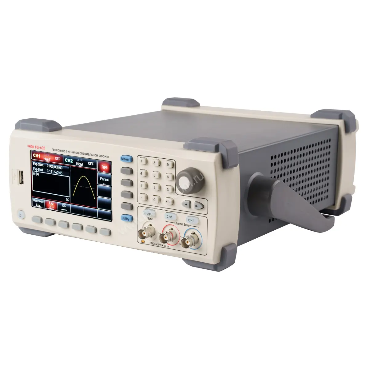 Форму произвольных сигналов можно задавать и редактировать на ПК, сохраняя данные в csv- или bsv-формате на внешнем носителе. Для его подключения генератор сигналов специальной формы RGK FG-602 оборудован USB-портом, который задействуется также для обновления встроенного ПО прибора и экспорта-импорта настроек.