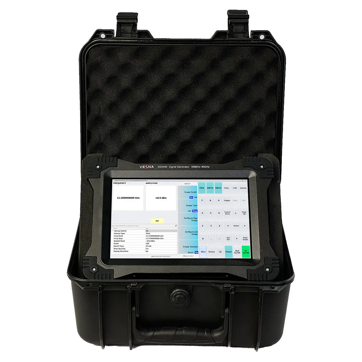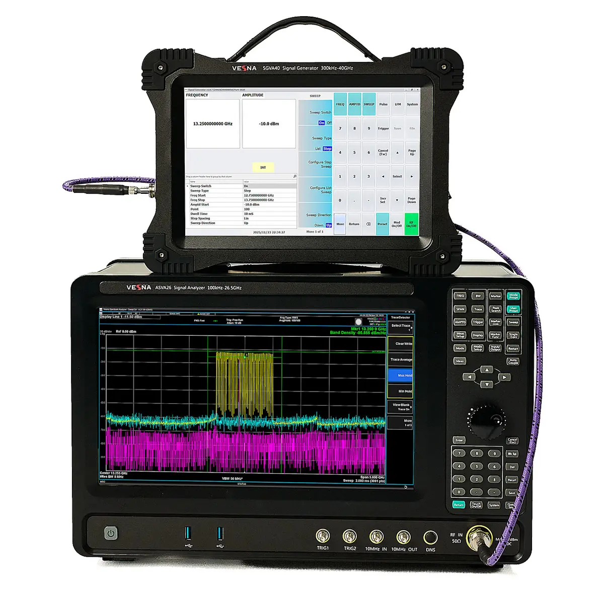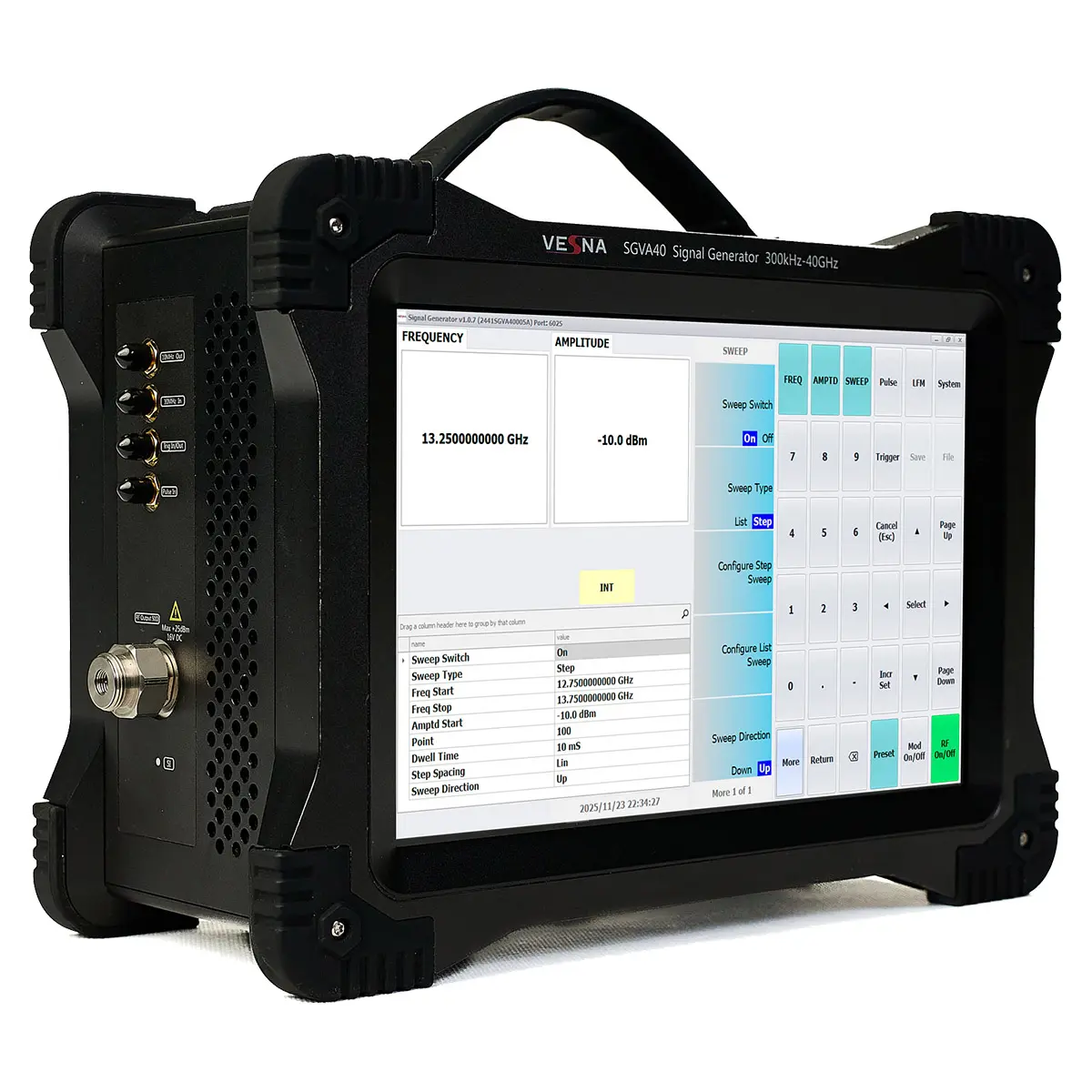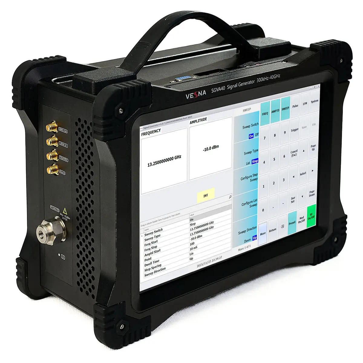Генератор сигналов VESNA SGVA40 — это высокоточный лабораторный прибор с диапазоном частот от 100 кГц до 40 ГГц, предназначенный для разработки, тестирования и калибровки радиоэлектронных систем нового поколения. Благодаря уровню фазового шума –127 дБн/Гц, высокой стабильности выходного сигнала и широкому набору модуляционных функций, он обеспечивает профессиональную поддержку в областях мобильной связи 5G/6G, спутниковой навигации, радиолокации и квантовых технологий.