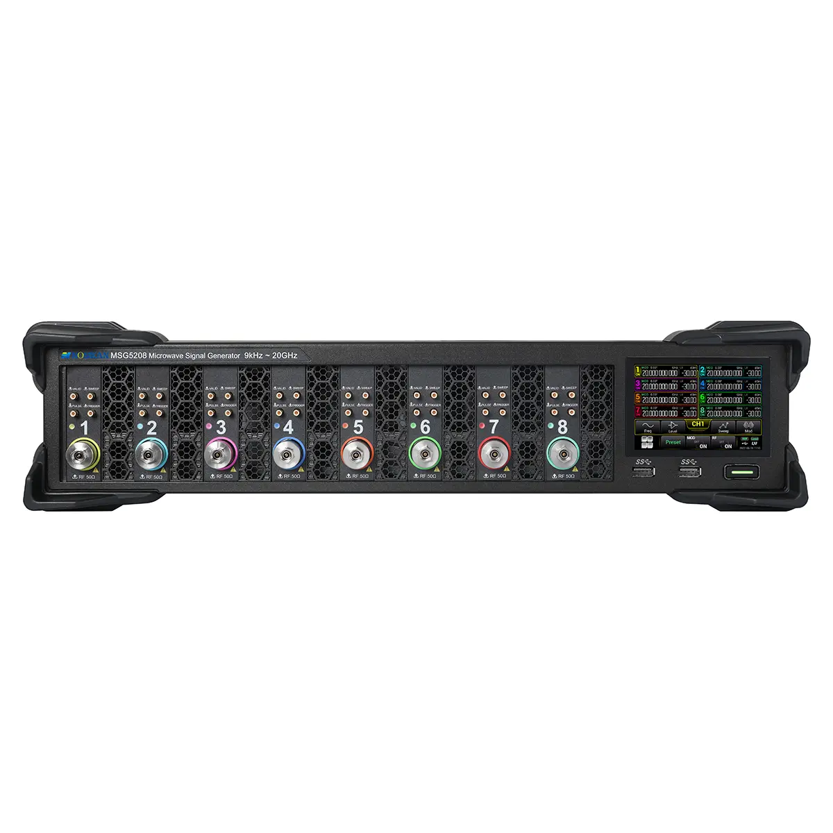 Высокочастотный РЧ-генератор сигналов Nosean MSG5208 (DSG5208) представляет собой 8-канальный лабораторный прибор с рабочим диапазоном до 20 ГГц и опциональной поддержкой амплитудной, частотной, фазовой и импульсной модуляции, и режима формирования последовательностей импульсов. Он может использоваться при выполнении тестирования или измерений в составе лабораторных установок, как когерентный источник радиочастот, либо в качестве отдельных одноканальных генераторов с индивидуальным управлением. Изделие подходит для сложных многоканальных и системных приложений при проведении квантовых исследований с реализацией QuBits, в ходе разработки коммуникационных MIMO-систем, радиолокационных средств, тестировании на ЭМС и т.п.