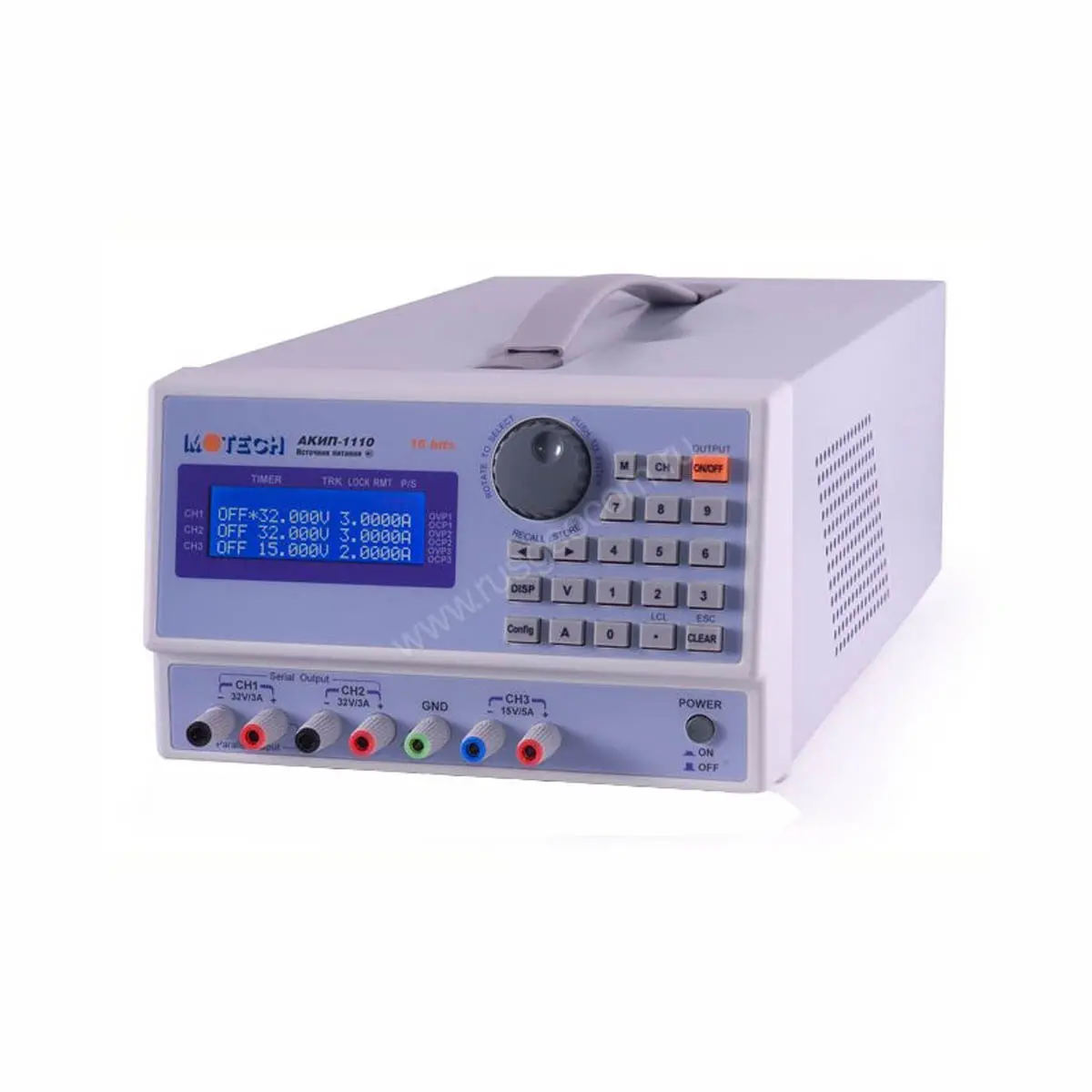 Источник питания АКИП-1110 - лабораторный прибор линейного типа средней мощности с функцией программирования на базе интегрированного 16-разрядного ЦАП и встроенной памяти. Устройство оборудовано двумя идентичными каналами с регулируемыми параметрами в пределах до 32 В/5 А и третьим выходом с фиксированным напряжением 15 В, который обеспечивает максимальную силу постоянного тока 5 А.