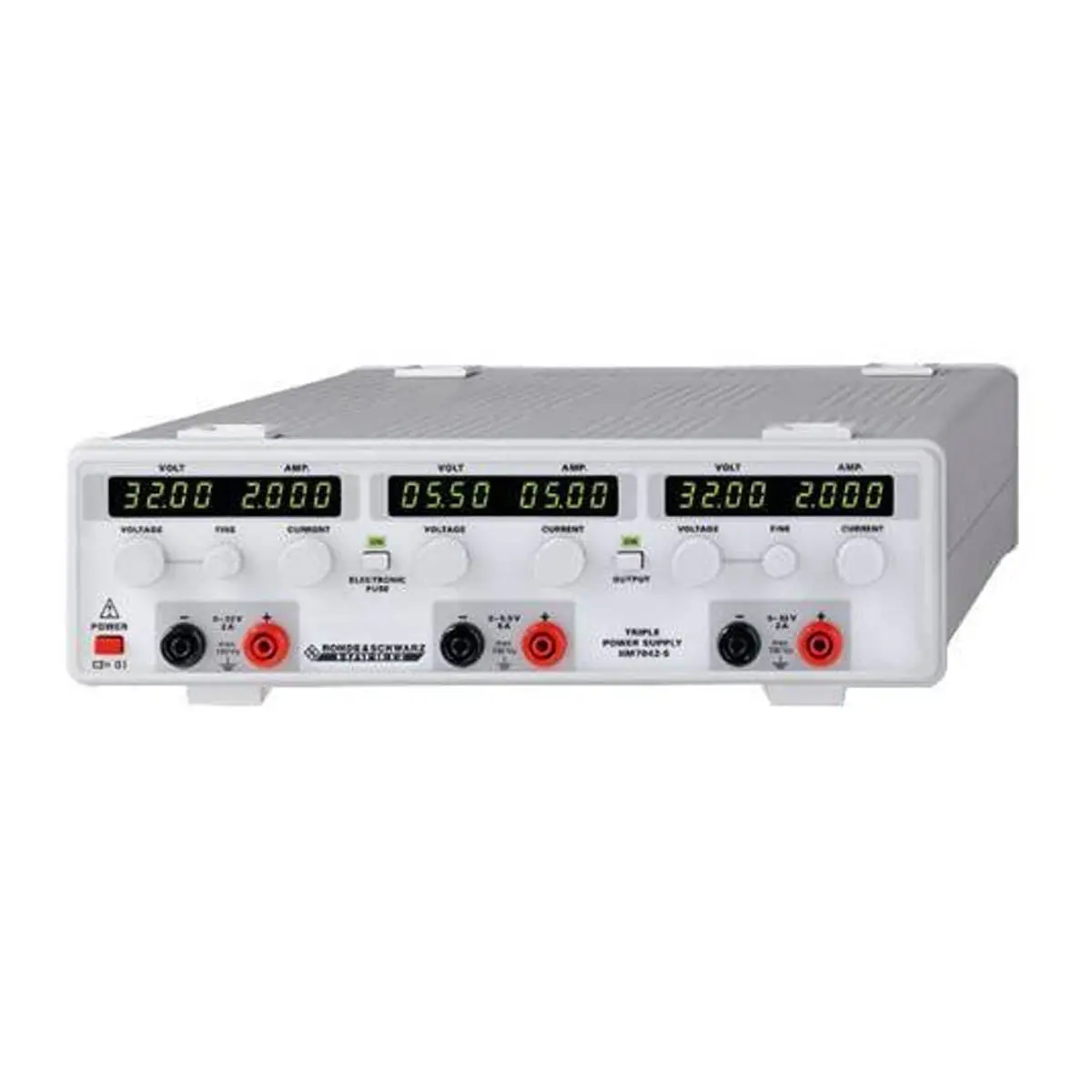 Трехканальный источник питания Rohde Schwarz HM7042-5 оборудован парой каналов с характеристиками 0-32 В/2 А и одним с параметрами 0-5,5 В/5 А. Прибор совмещает в себе преимущества линейной схемы - высокую стабильность и низкий уровень помех, с плюсами импульсного регулятора мощности, который минимизирует потери на преобразование при изменении напряжения на выходе.