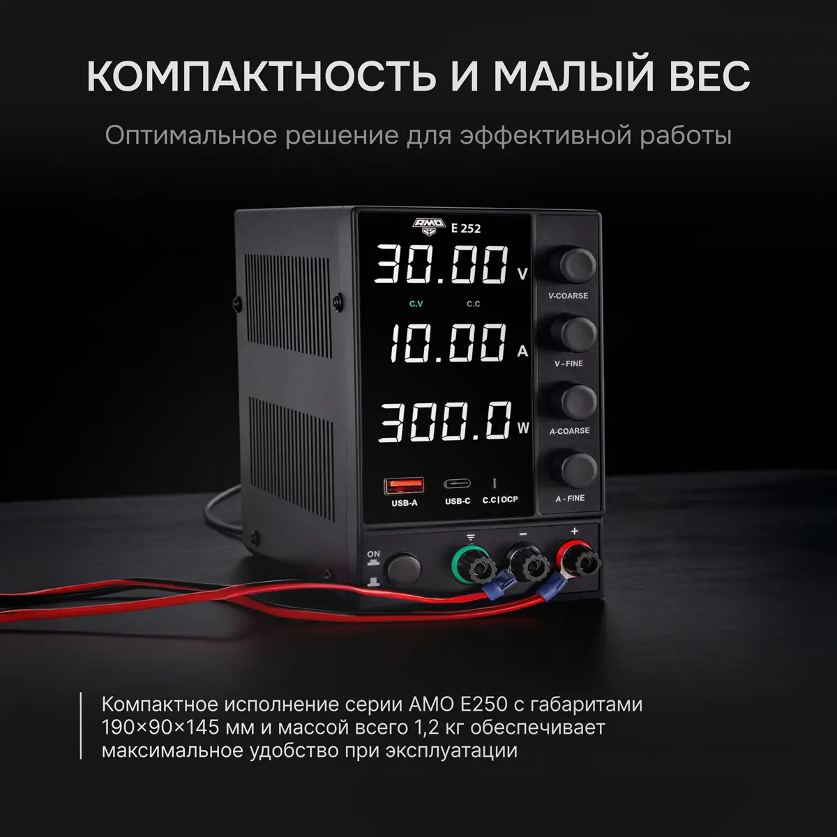 При нормальной работе блок питания AMO E252 функционирует в режиме стабилизации напряжения (CV). Если нагрузка потребляет ток, превышающий заданный лимит, прибор автоматически переключается в режим стабилизации тока (CC), ограничивая выход и защищая цепь от перегрева. Индикаторы CV/CC на передней панели позволяют визуально контролировать текущий режим без измерительных приборов.
