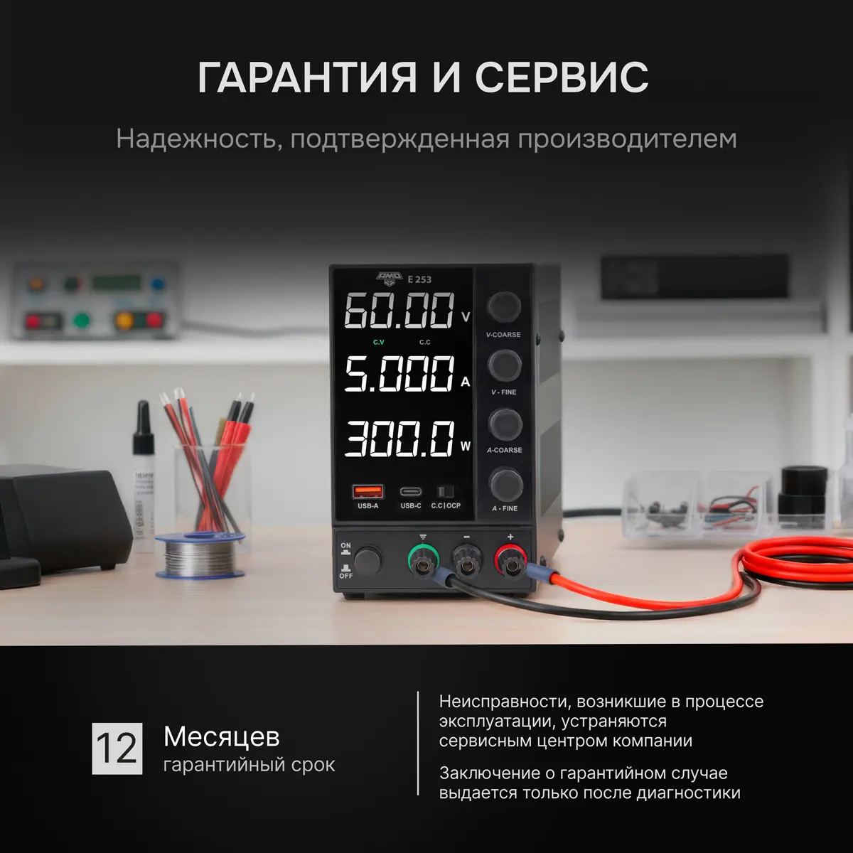 - Автоматический переход между режимами стабилизации напряжения (CV) и стабилизации тока (CC)