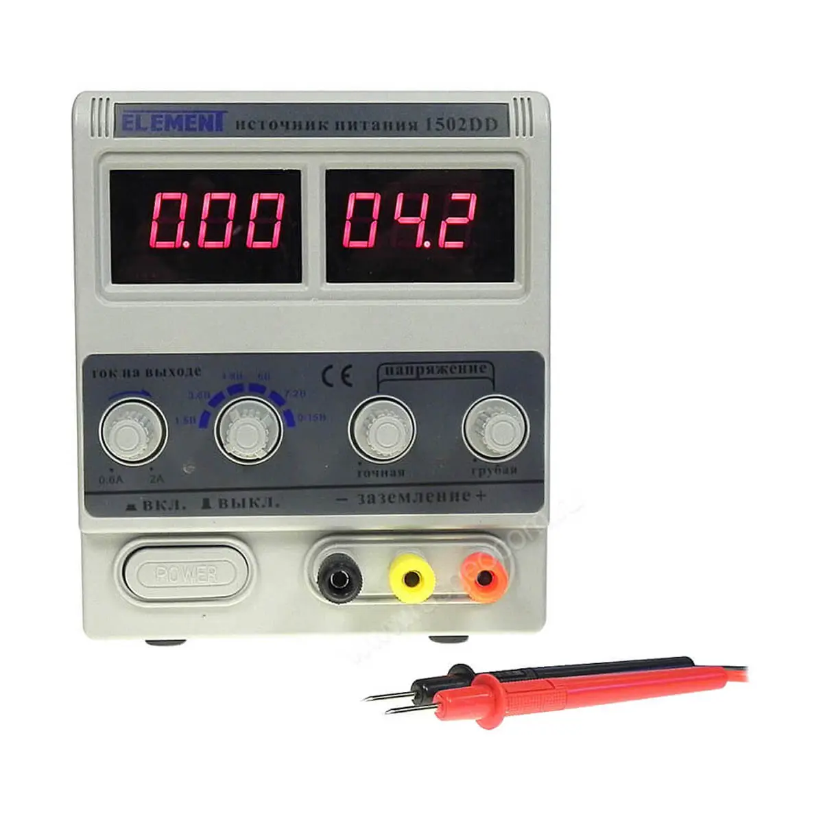 Источник питания постоянного тока ELEMENT 1502DD – модель начального уровня, выполненная на основе линейной схемы с транзисторной стабилизацией. Пользователю доступны регулировки выходного напряжения в пределах от 0 до 15 В и максимальной силы тока до 2 А. Прибор оснащен функциями стабилизации по напряжению и ограничения по силе тока, за счет чего может использоваться для питания маломощных потребителей, таких как мобильные телефоны, планшеты, сборки на основе плат Arduino и другой низковольтной электроники в ходе диагностики, ремонта и отладки. Источник питания отличается компактностью и удачно вписывается в рабочее место небольшой мастерской. Благодаря доступности, простоте и наглядности эта модель является привлекательным для домашних мастеров.