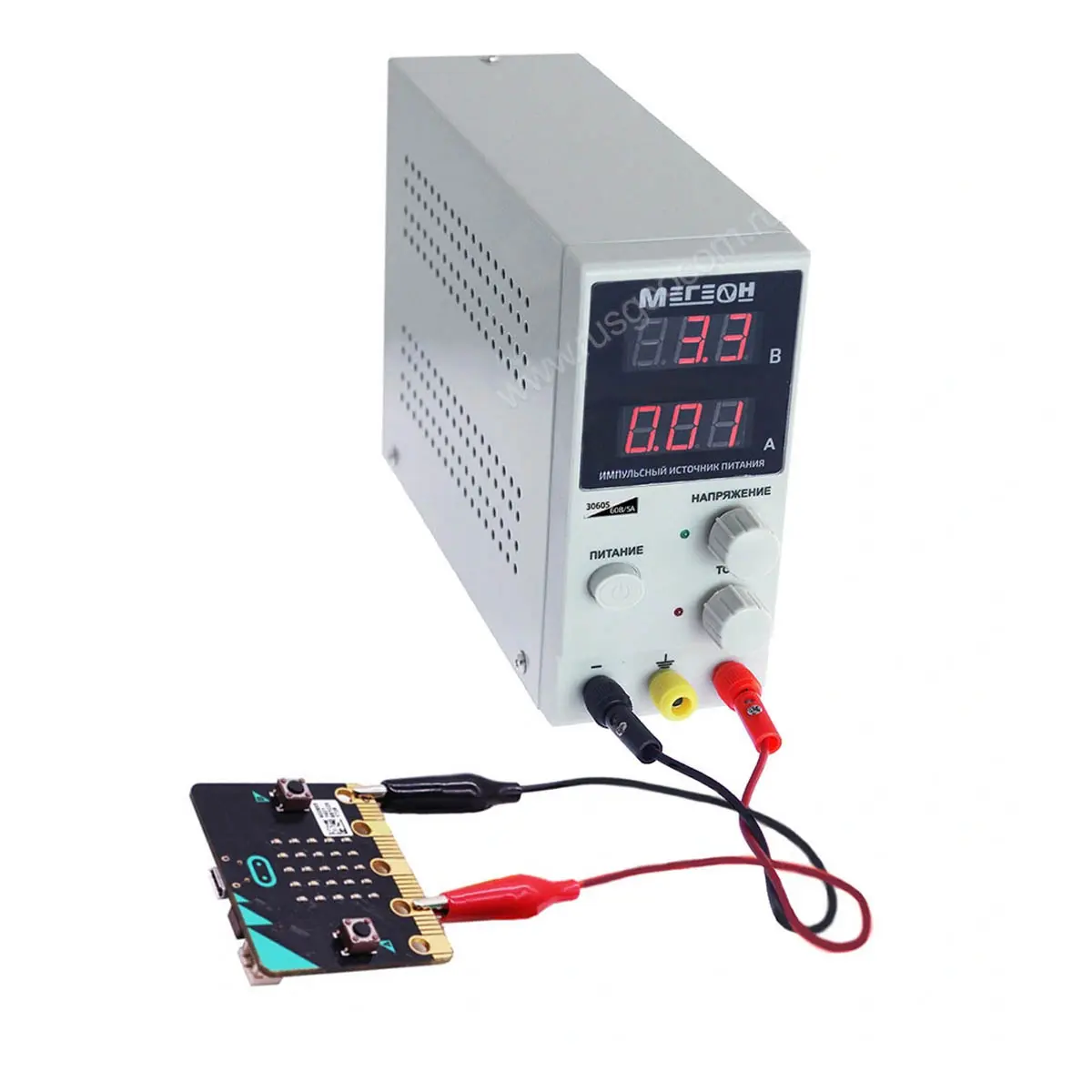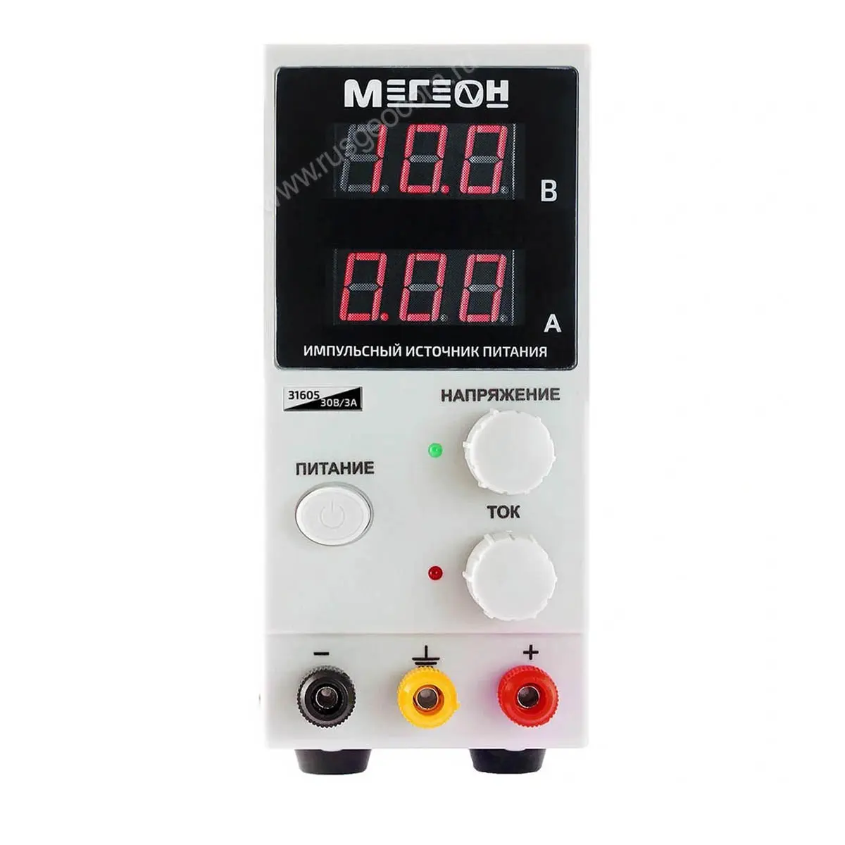 Все необходимые элементы управления расположены на лицевой панели источника питания Мегеон 31605. Установленные параметры напряжения и тока выводятся на дисплей. Данный источник питания обеспечивает высокую стабильность, а также впечатляющие шумовые характеристики, которые соответствуют современным стандартам и позволяют работать с современными электронными устройствами.