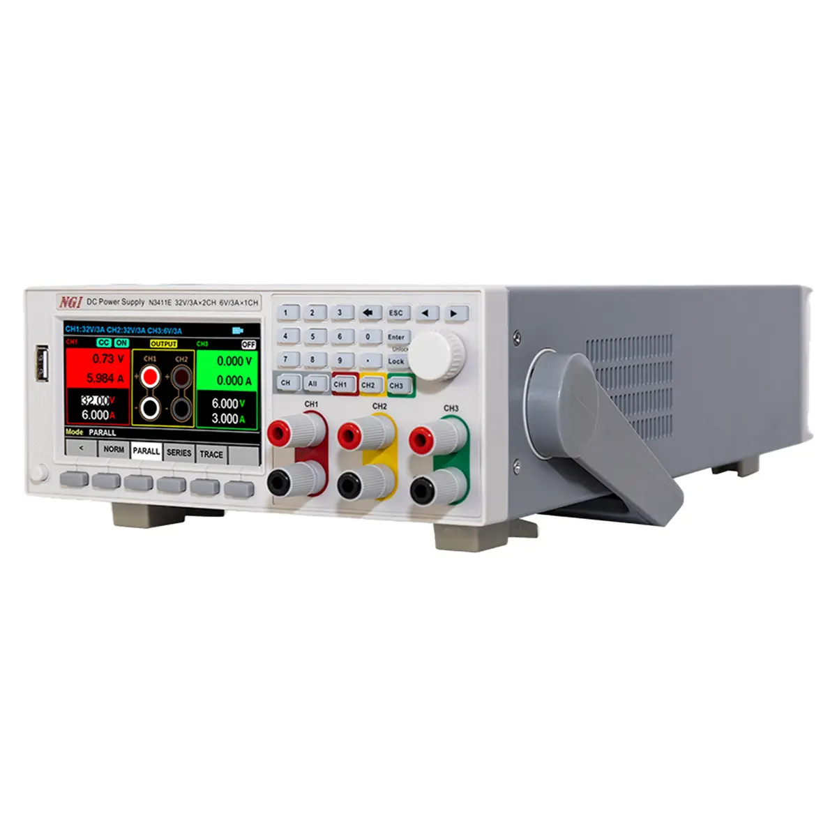 Источник питания NGI N3411 представляет собой программируемое устройство лабораторного класса с электрической мощностью 210 Вт, с тремя интегрированными каналами, два из которых способны выдавать напряжение/силу тока до 32 В/3 А, а третий до 6 В/3 А. Изделие выполнено в компактном корпусе с поворотной ручкой и может использоваться как переносной прибор в настольном варианте, либо монтироваться в стойку, для чего на задней панели размещен дополнительный терминал с силовыми выходами. Модель снабжена цветным 4,3-дюймовым ЖК-дисплеем, а также портами LAN и RS232 для подключения к ПК, поддерживая дистанционное управление по протоколу Modbus RTU.