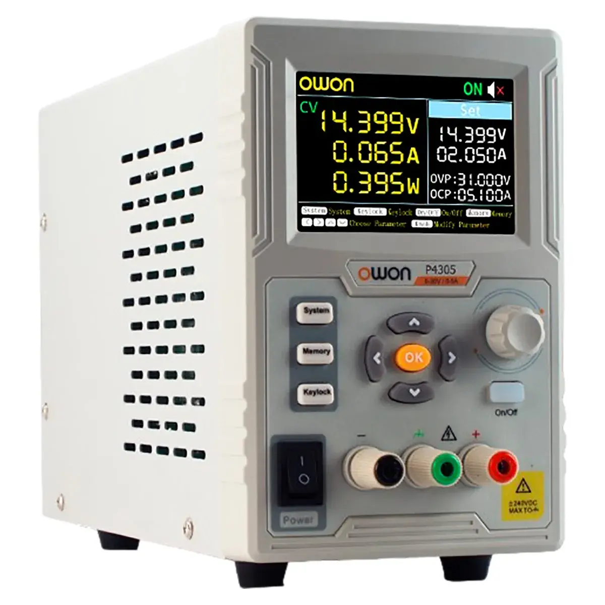Все органы управления, включая клавишу включения-выключения одноканального блока питания OWON P4305, размещены на лицевой панели, что обеспечивает комфортность обращения с изделием в ограниченном рабочем пространстве. Отдельная кнопка подключения-отключения нагрузки, которая для наглядности снабжена подсветкой, включающейся при активации, позволяет предварительно выставлять параметры с высокой точностью до подачи напряжения на выходные клеммы, что повышает безопасность работы с прецизионными потребителями. Предусмотрена возможность блокировки органов управления соответствующей клавишей для недопущения случайного изменения настроек.