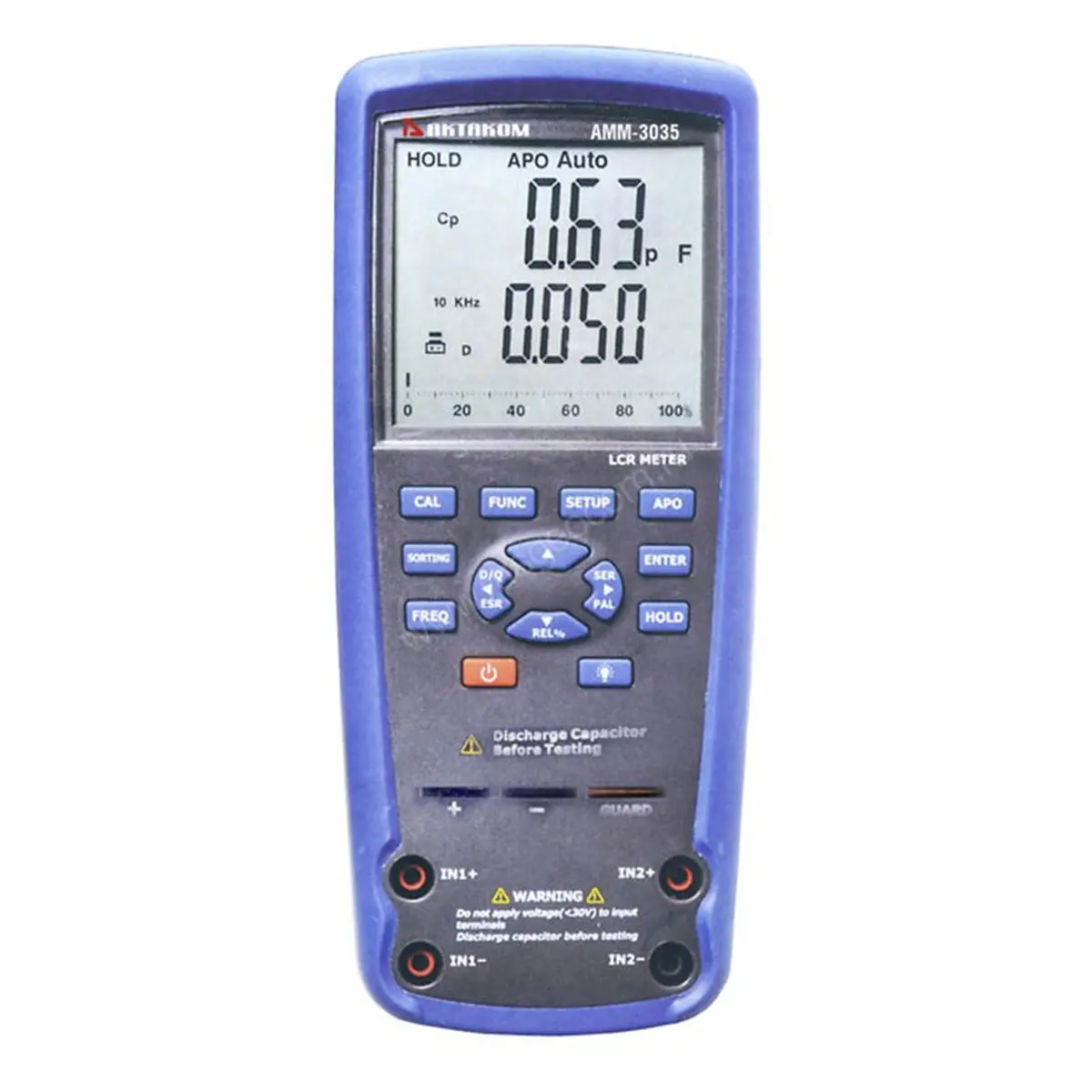 Профессиональный водонепроницаемый RLC-метр АММ-3035 — современный прибор с инновационной технологией автоматического измерения индуктивности, ёмкости, сопротивления, добротности, тангенса угла потерь или фазового угла и режимом определения полярности. Тестовая частота прибора составляет до 100 кГц.