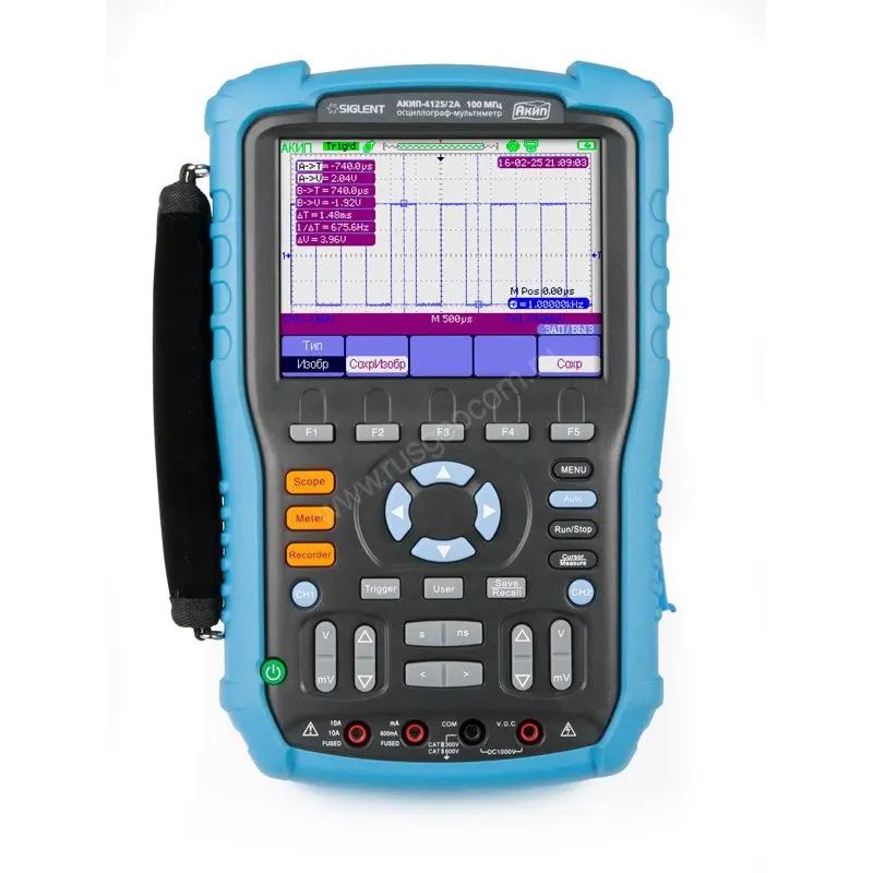 Цифровой осциллограф, мультиметр с функцией TrendPlot. Автоматические и курсорные измерения. Синхронизация по длительности импульса и ТВ. Математические функции и БФП. Регистратор - 7 МБ. Мультиметр - измерение напряжения, тока, сопротивления, емкости, прозвонка цепи, проверка диодов. TrendPlot - 800 кБ (осциллограф), 1,2 МБ (мультиметр). Батарейное питание - Li-ion аккумулятор (до 5 ч).