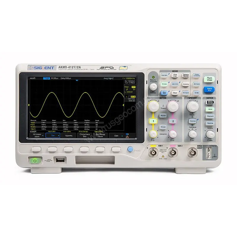 Высокая скорость обновления экрана до 60.000 осц./сек. Режим сегментированной памяти. Режим HISTORY. Интерполяция - Sin X/х, линейная. Автоматические (до 36-и параметров) и курсорные измерения. Математические функции, БФП. Опции - синхронизация и декодирование сигналов.