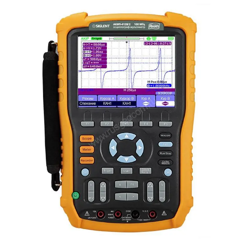 Изолированные входы. Цифровой осциллограф, мультиметр с функцией TrendPlot. Автоматические и курсорные измерения. Синхронизация по длительности импульса и ТВ. Математические функции и БФП. Регистратор - 7 МБ. Мультиметр - измерение напряжения, тока, сопротивления, емкости, прозвонка цепи, проверка диодов. TrendPlot - 800 кБ (осциллограф), 1,2 МБ (мультиметр). Батарейное питание - Li-ion аккумулятор (до 5 ч).