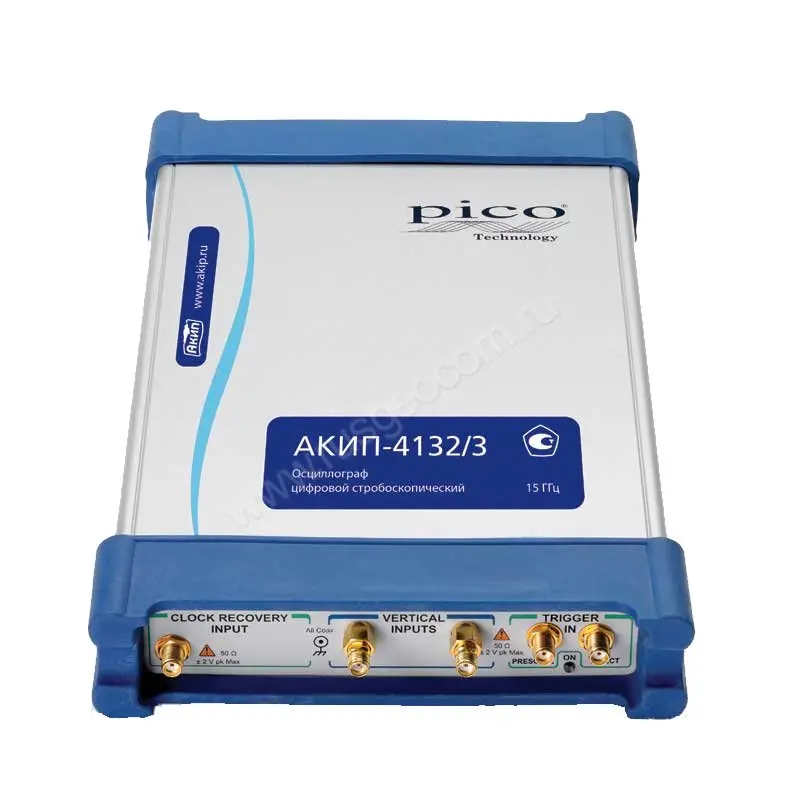 Цифровой стробоскопический USB-осциллограф. Максимальная частота стробирования до 1 МГц. Внешняя синхронизация до 2,5 ГГц, с делителем частоты до 15 ГГц. Дополнительный вход, внешняя синхронизация с восстановлением тактовой частоты | до 11,3 Гб/с. Автоизмерения (более 100 параметров включая измерение "глазковых" диаграмм (NRZ и RZ), БПФ и джиттера и др.), статистика измерений, маркерные измерения (ΔU, ΔT, ΔU/ΔT, F). Математические функции, включая быстрое преобразование Фурье (БПФ) в 2-х каналах. Отображение гистограмм параметров (напряжение/ время), усреднение, огибающая, послесвечение. Автоматизированный тест сигнала по "маске" (более 160 предустановленных шаблонов).